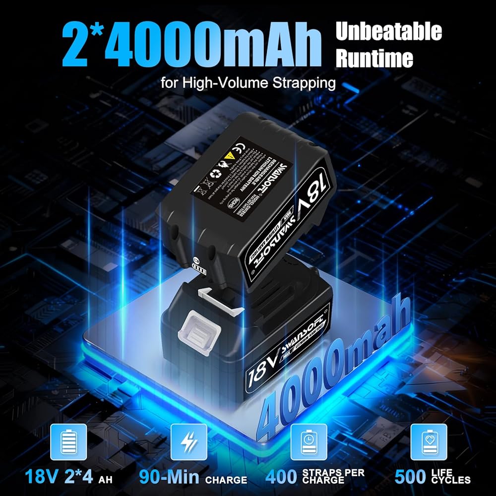 400 حزام: تم تجهيز آلة الربط الكهربائية هذه ببطاريتين بقدرة 4000 مللي أمبير في الساعة مما يسمح بالتبديل السلس. يتم شحن كل بطارية بالكامل خلال 90 دقيقة فقط وتدعم ما يصل إلى 400 عملية ربط لكل شحنة، مع عمر افتراضي يصل إلى 500 دورة شحن. يعمل هذا التصميم على تحسين كفاءة سير العمل بشكل كبير، خاصة في البيئات عالية الطلب.