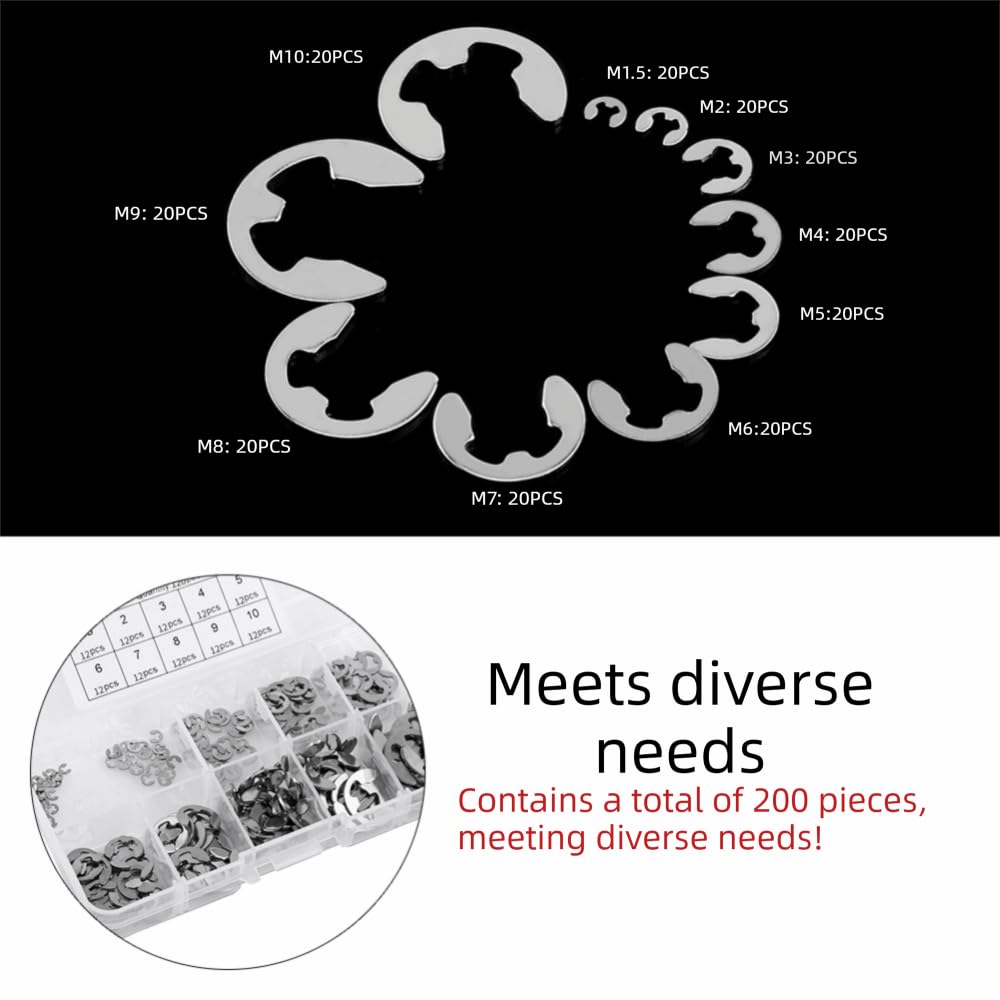 Package includes one organized plastic storage box containing 200 pieces of E-type circlips in multiple sizes. The compartmentalized case keeps rings sorted and accessible.
