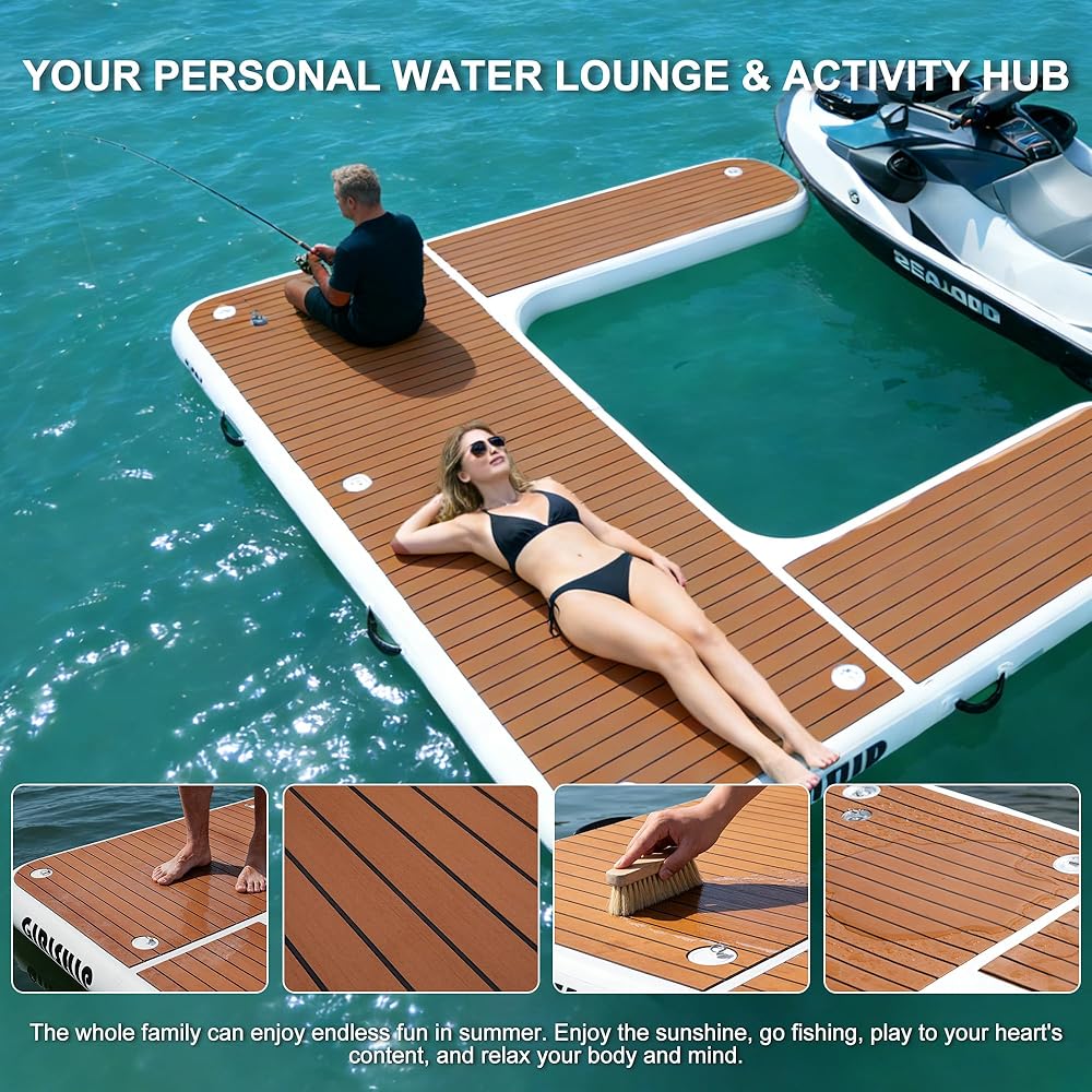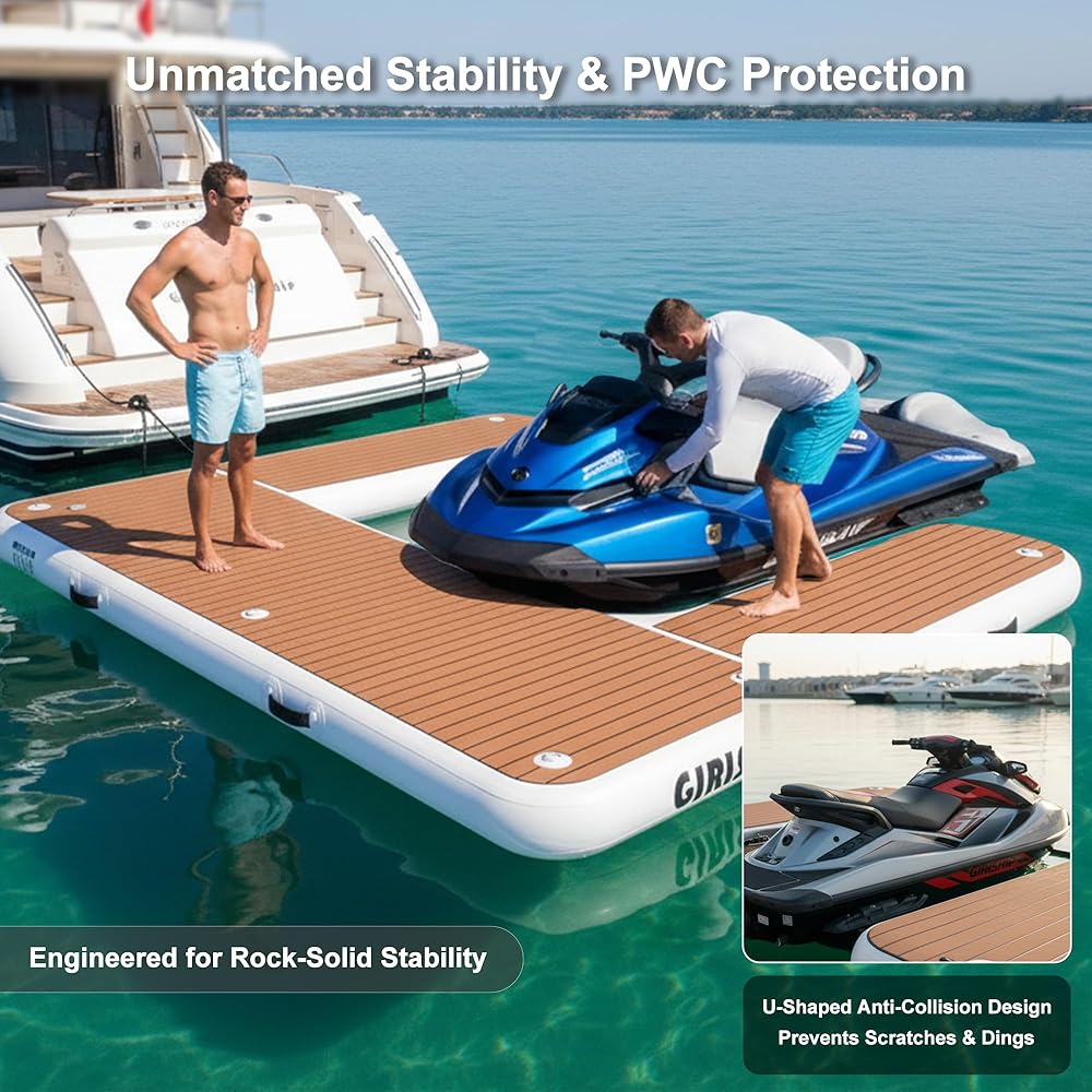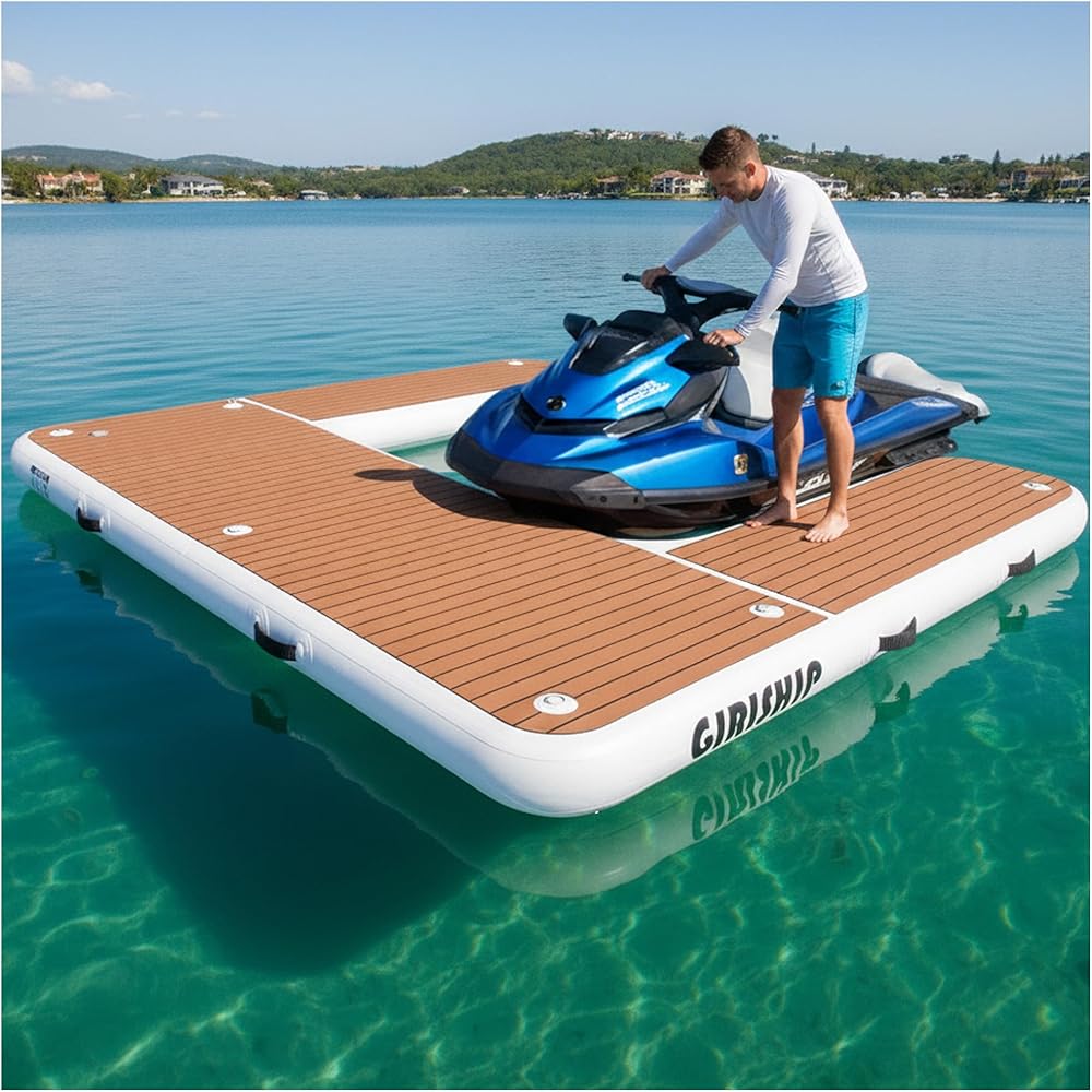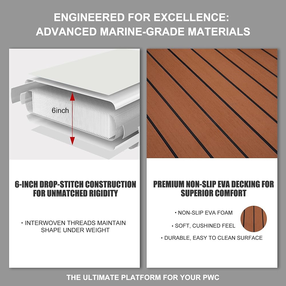 رصيف عائم صلب قابل للنفخ: PVC شديد التحمل ذو غرز متدلية يخلق منصة عائمة صلبة بسمك 6 بوصات. توفر منصة PWC هذه استقرارًا لا مثيل له على البحيرة أو المحيط أو المرسى للعديد من البالغين