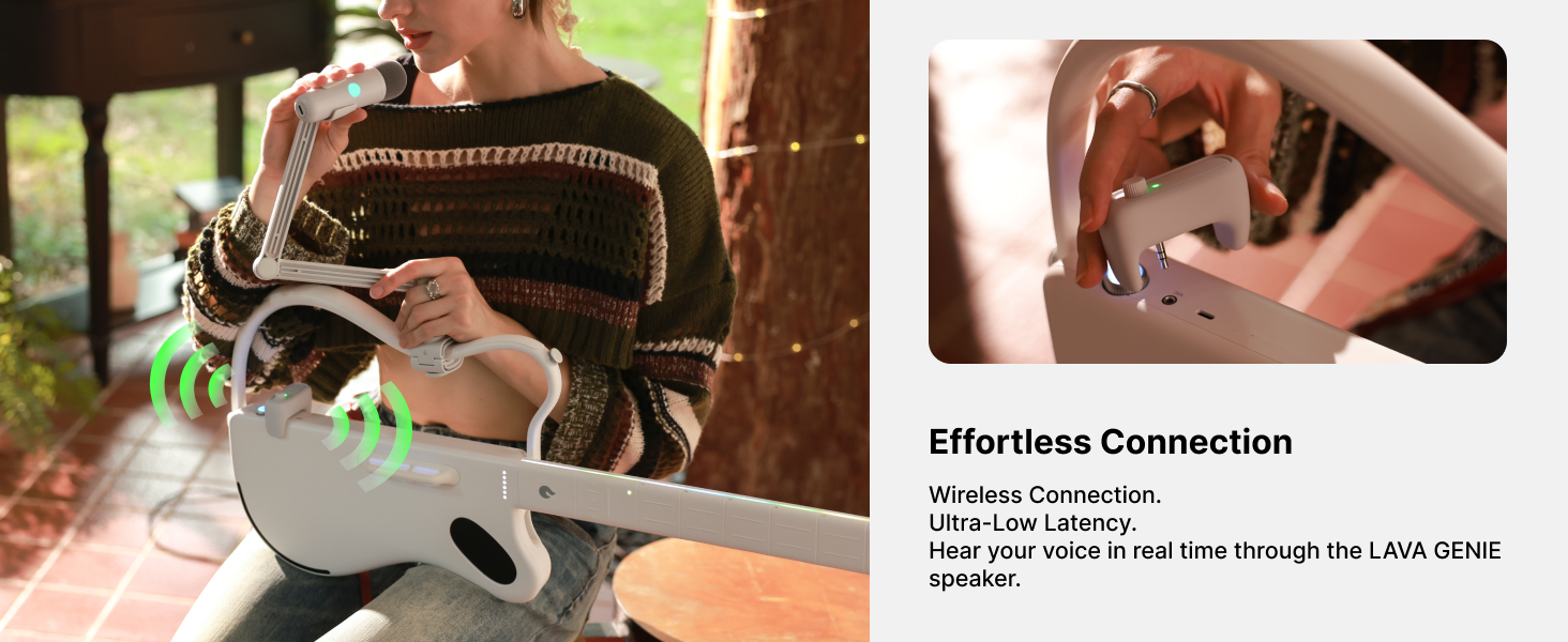 • 🎶【اتصال بدون مجهود】اتصال لاسلكي بجيتار LAVA GENIE الذكي مع زمن استجابة منخفض للغاية. استمع إلى صوتك في الوقت الفعلي تقريبًا من خلال مكبر الصوت المدمج في الجيتار. جهاز استقبال لاسلكي متضمن.