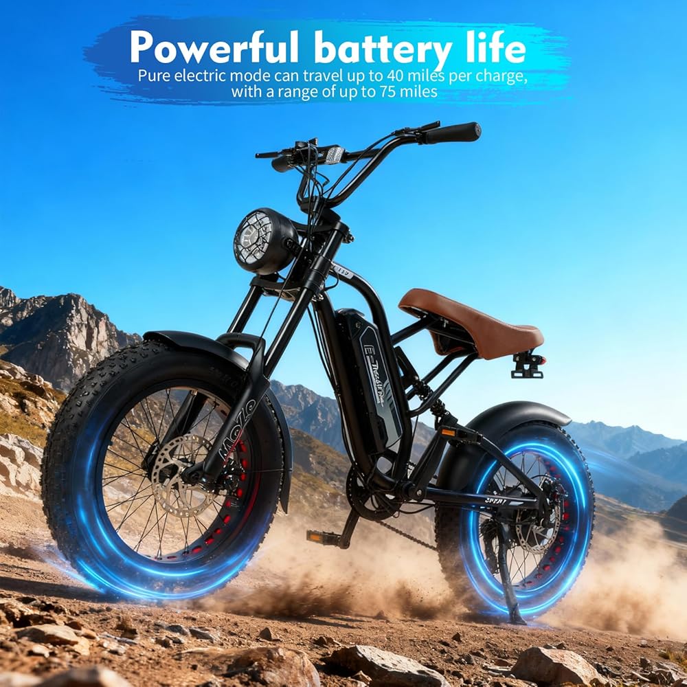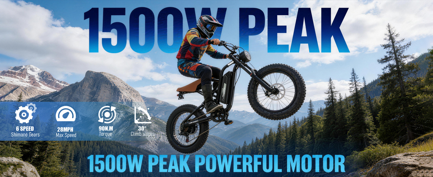 دراجة كهربائية 1500 واط للبالغين - 25 ميلاً في الساعة و40 ميلاً، ذروة عزم الدوران محرك 1500 واط يتسلق تلال 30 درجة بسرعة 25 ميلاً في الساعة (متوافق مع الفئة 3). يعمل الشحن لمدة 5-6 ساعات على توفير الوقود لمسافة 40 ميلاً للممرات أو التنقلات