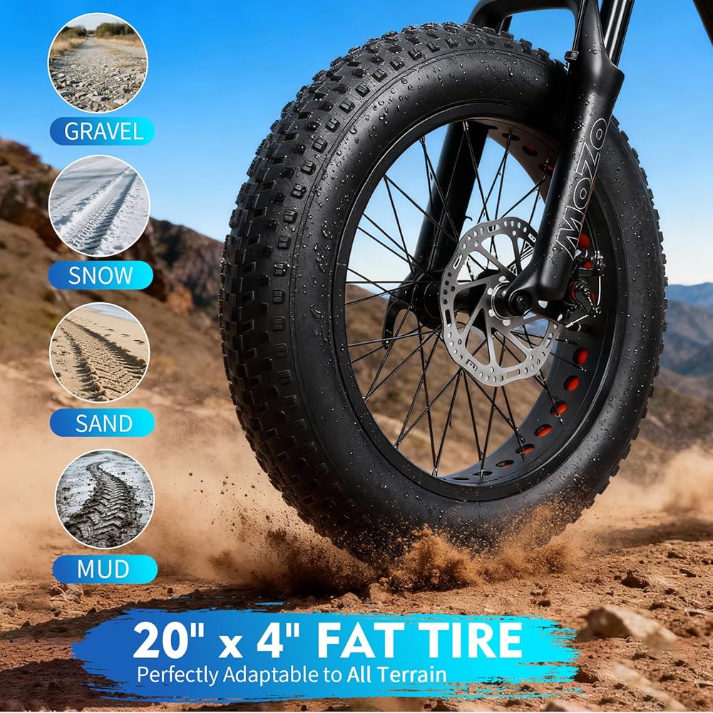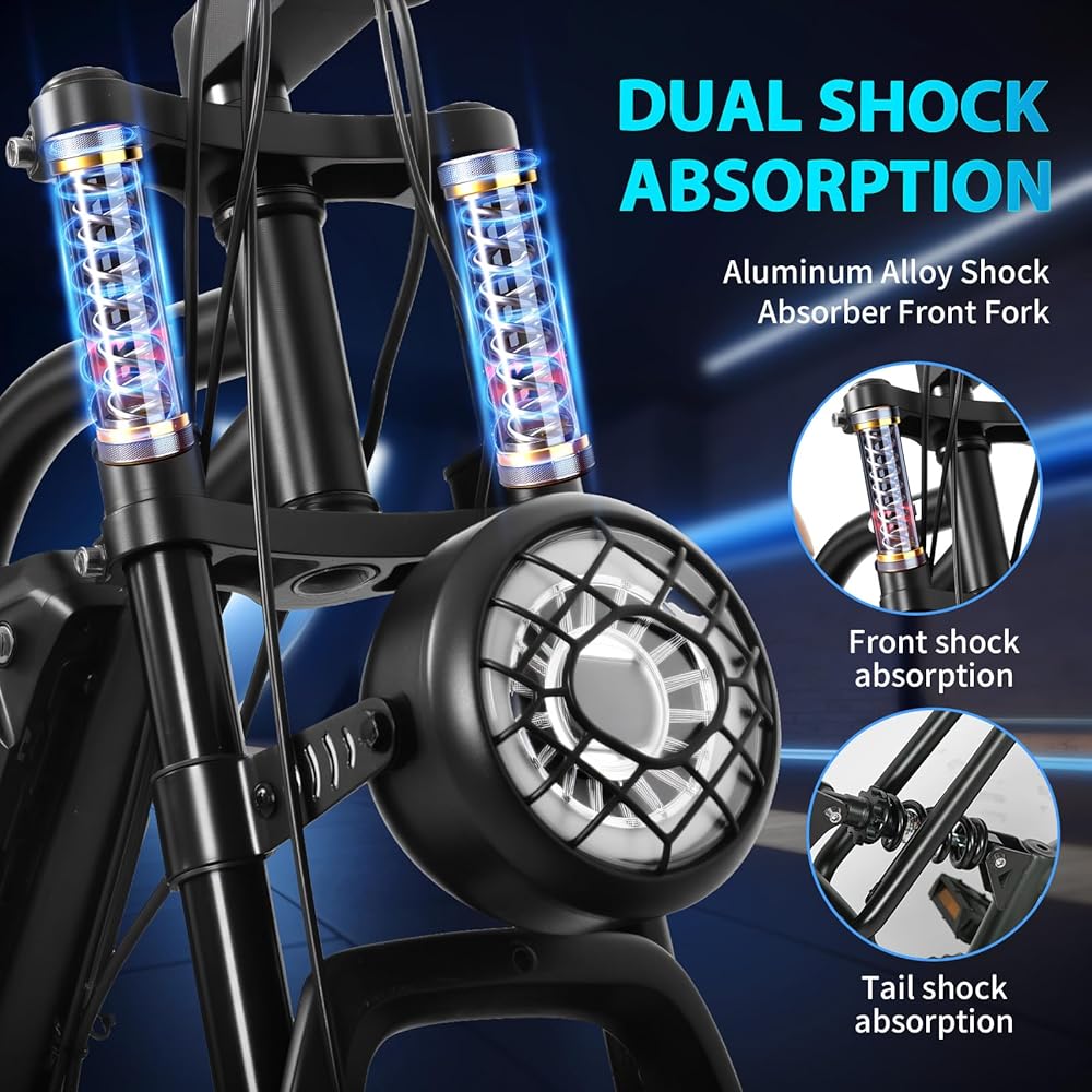الهيمنة على جميع التضاريس - أقراص مزدوجة وإطارات سمينة نظام تعليق بخمسة مستويات + إطارات مقاومة للثقب مقاس 20 بوصة تأكل المطبات. تتوقف المكابح ذات الأقراص المزدوجة على الفور عند الوحل/المطر. مصممة للثلج أو الصخور أو الحفر