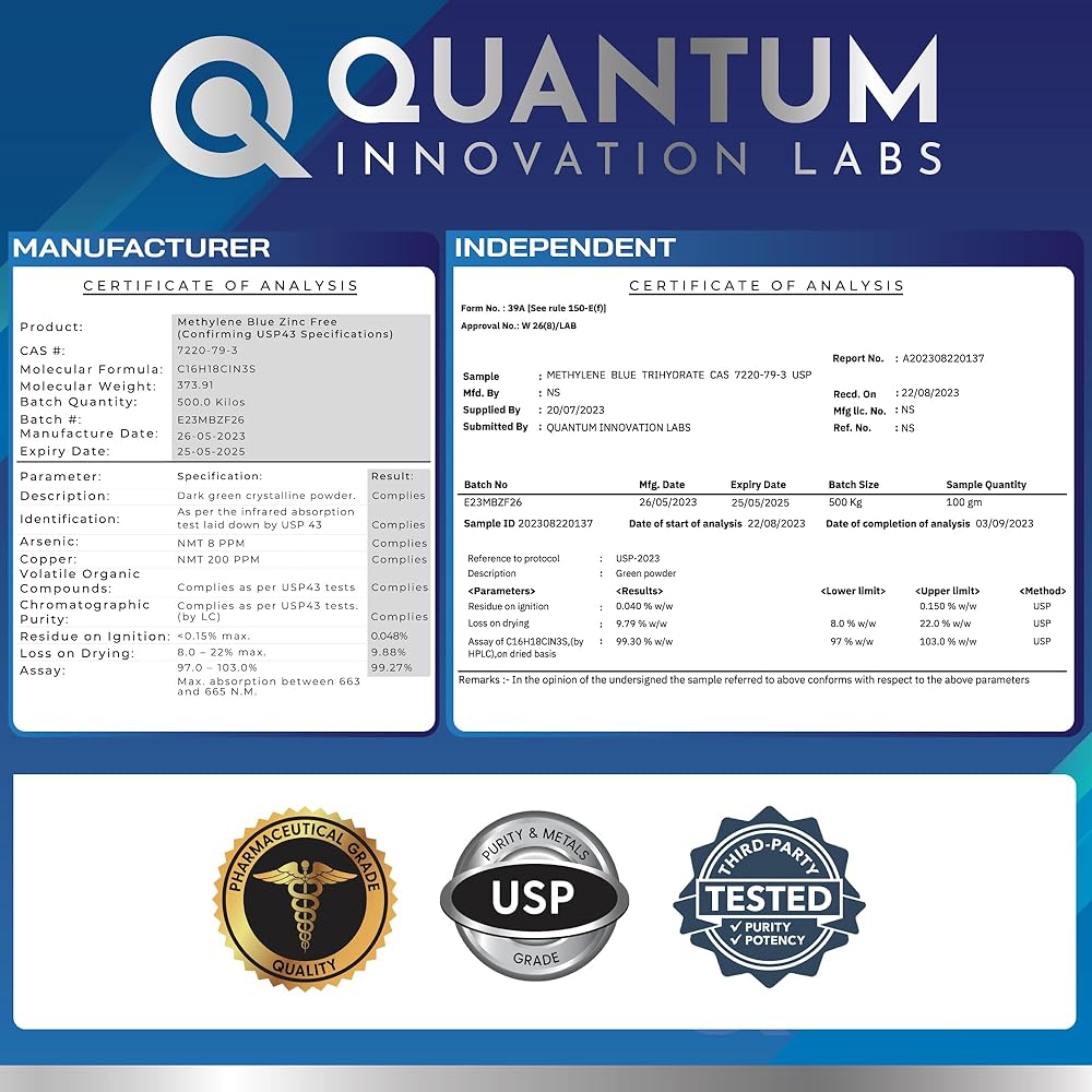 RELIABLE QUALITY ASSURANCE - Each batch undergoes independent testing in an ISO certified lab, guaranteeing that our methylene blue powder consistently meets or exceeds the current USP monograph guidelines.