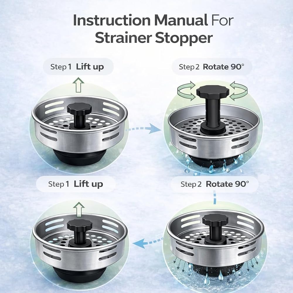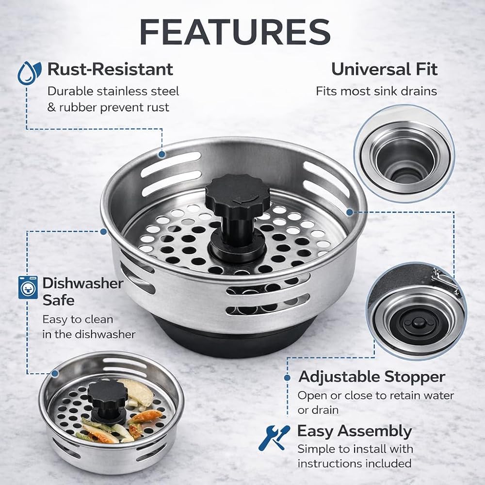 ADJUSTABLE STOPPER FUNCTION: Dual functionality allows you to close the stopper to retain water in the sink or open it to drain water while effectively catching food debris in the basket