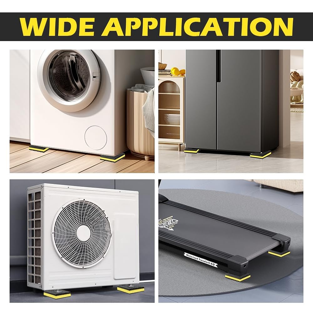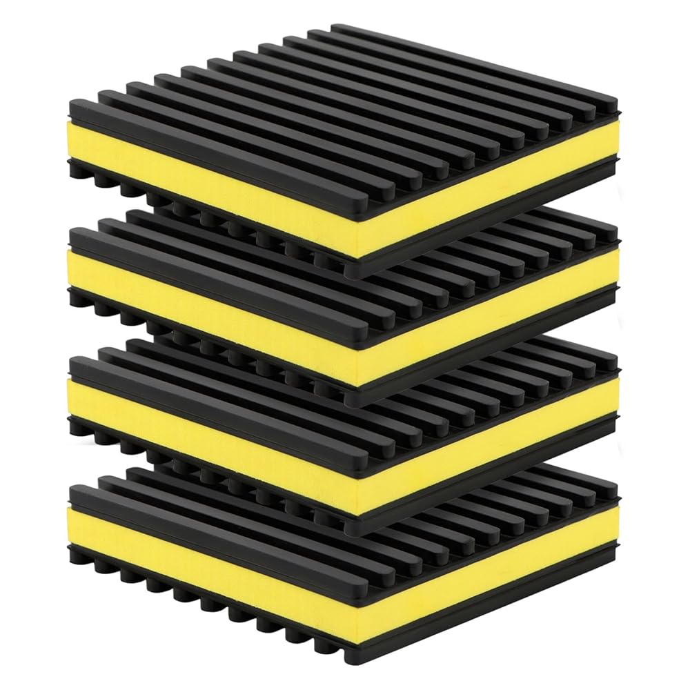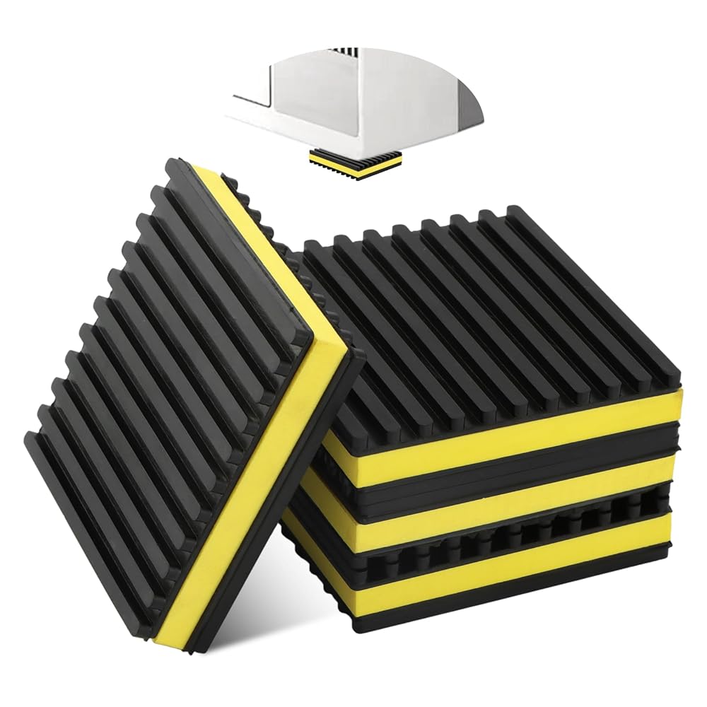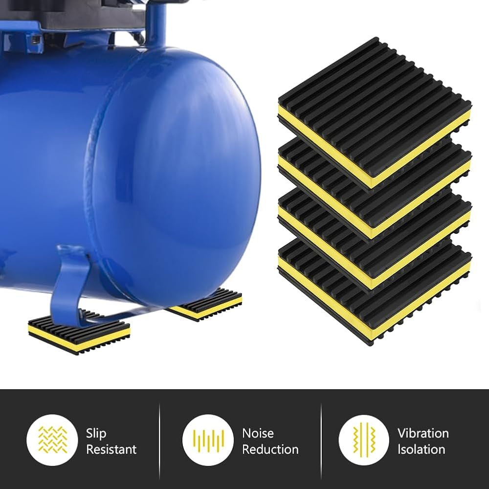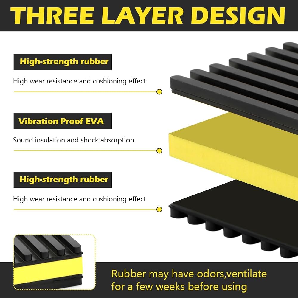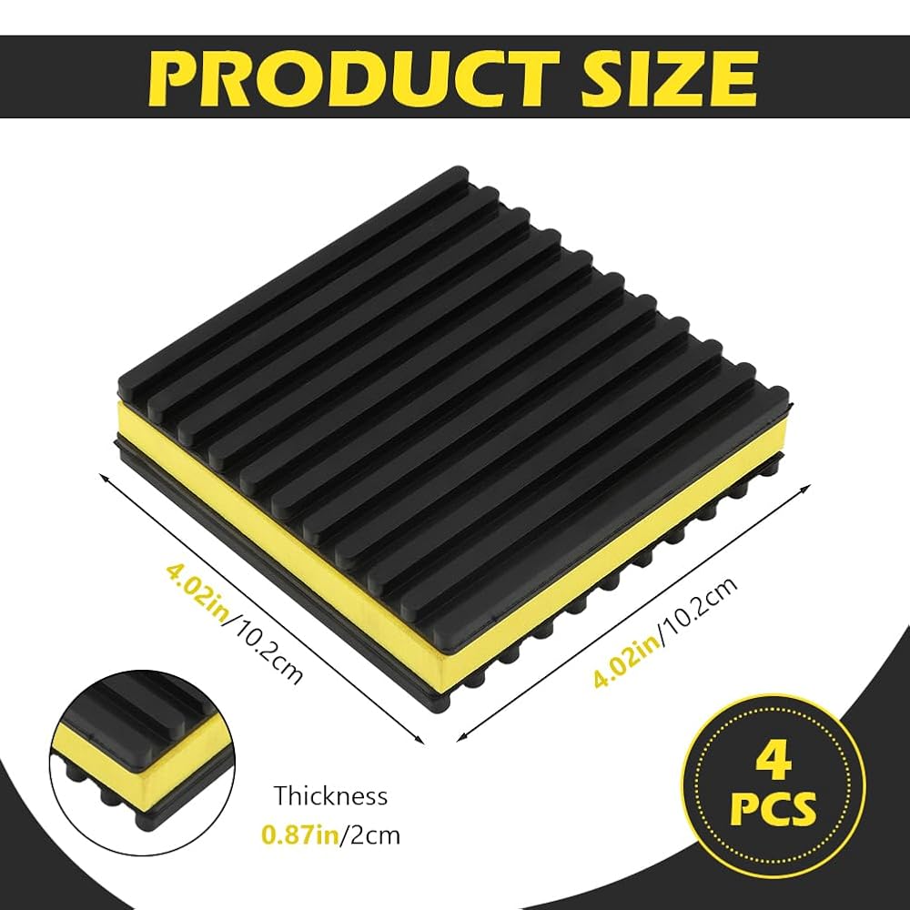 【Loading Capacity】Indoor or Outdoor Rated, 60 PSI max load, 960 lbs per pad max. Vibration absorbing mats measure 4'' x 4'' x 7/8", you will receive 4 pads for daily use and easy installtion.