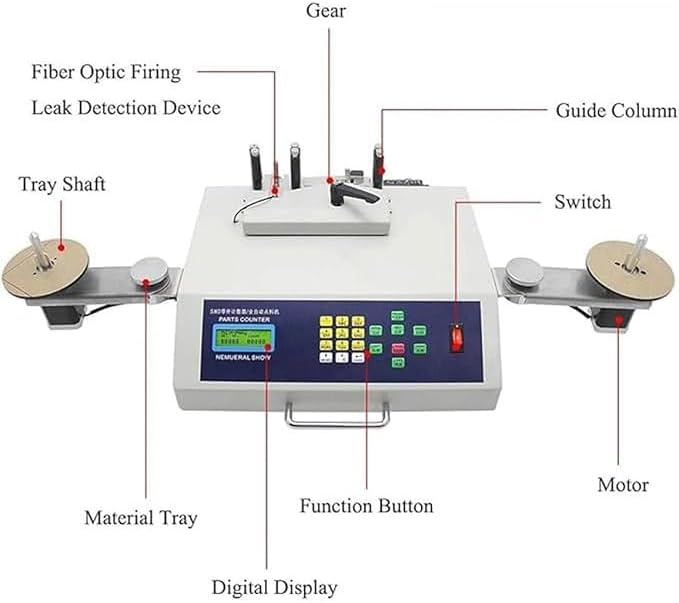 This automatic counter is specifically designed for counting various SMD materials such as resistors, magnetic beads, capacitors, diodes, ICs, chips, and LED lamp beads. It is widely used in the electronic product manufacturing industry, SMT processing plants, SMD parts manufacturers, parts counters, and taping packaging manufacturers for fully automatic incoming inspection, missing parts inspection, and inventory management.