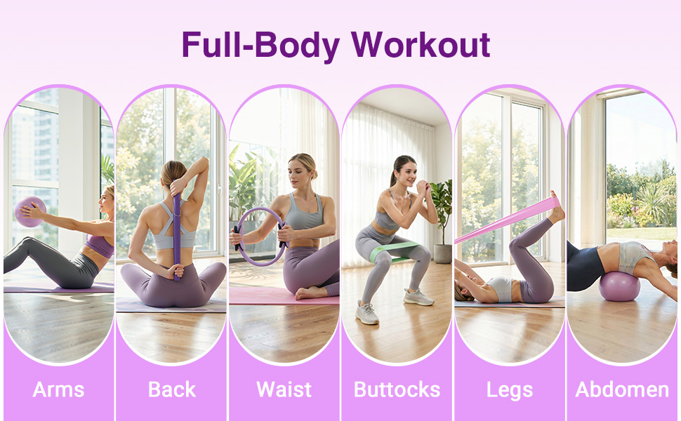 • 12 piece At Home Pilates Kit: This set includes a 13'' Pilates ring, a 9.8'' fitness ball, 5 levels resistance bands, a stretching band, a storage bag, and a detailed exercise guide. Specifically designed for women's home workouts, it helps beginners quickly master basic Pilates moves. Whether you aim to train your core strength, enhance flexibility, or relieve daily fatigue, this equipment set can perfectly meet your needs.