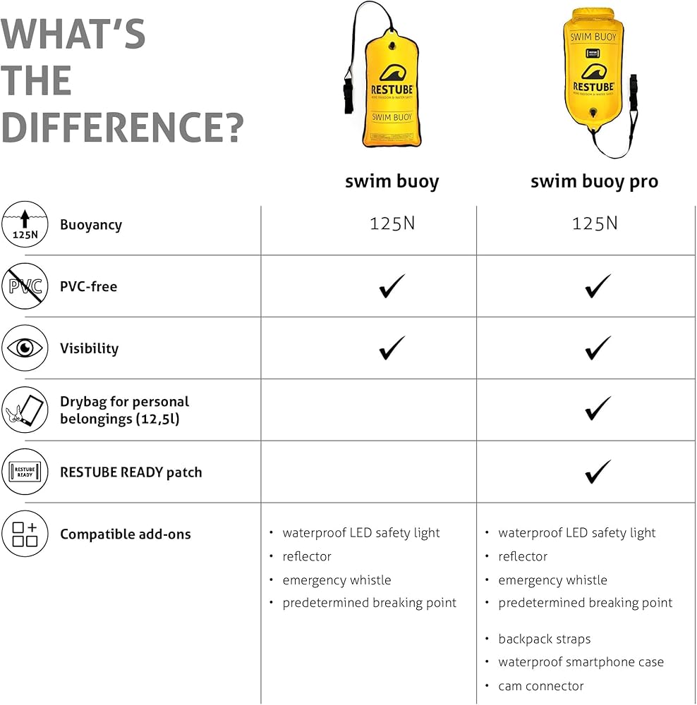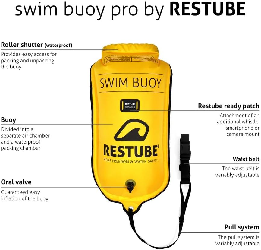 سلامة معززة في المياه المفتوحة - ابق مرئيًا وواثقًا أثناء السباحة في المياه المفتوحة مع عوامة السباحة الكلاسيكية من Restube، المصممة لزيادة السلامة دون تقييد أدائك.