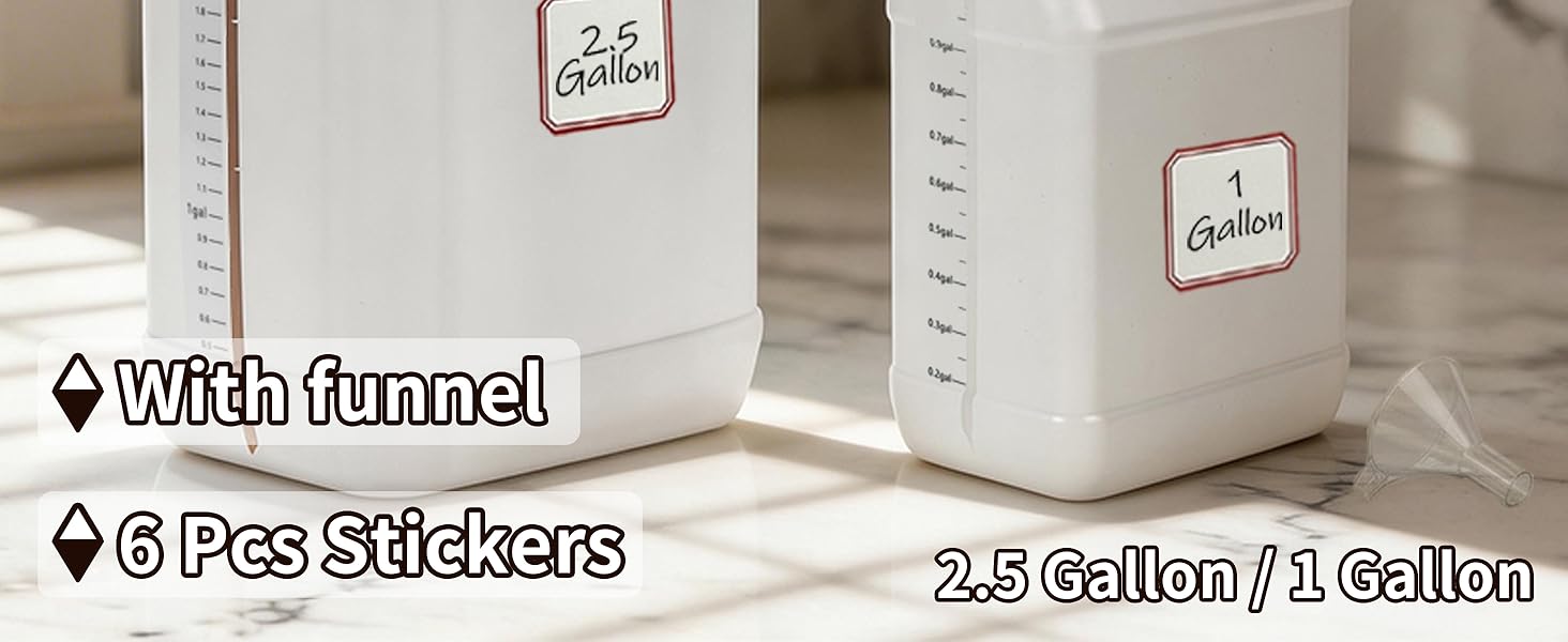 • هدية: هدايانا المتضمنة مع قمع بقطر 7.5 سم للحشو بدون فوضى و6 قطع من الملصقات العادية لسهولة التنظيم (57.5 مم × 64.5 مم). استخدم أباريق المياه متعددة الاستخدامات هذه لتخزين الماء أو الحليب أو الصلصات أو سوائل السيارات في أي مكان.