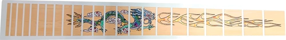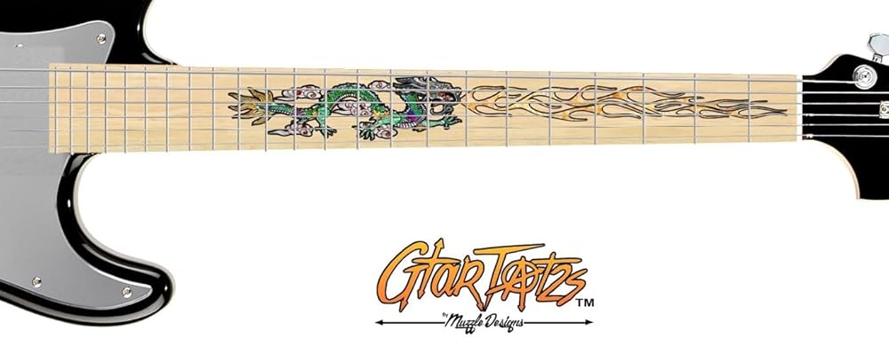 Full cover fretboard Fret*Skinz$. These come in in stock Faux woods. They come in pre-cut squares that fit most any 6 string electric guitar. Never has it been easier to install one of our inlays. Designed to fit up to 24 Fret guitars. Fits most 6 string electric guitars. (Tested on 24.75 & 25.5 scales) These are Printed Vinyl Stickers with a matte lamination. sweat proof, waterproof, fade resistant. Super easy to apply. They won't hinder your playing. They stay put until you decide to pull them off.. Stock Skin Measurments (Millimeters) 1st Fret: 34.150 x 40.427 2nd Fret: 30.968 x 41.441 3rd Fret: 28.956 x 42.395 4th Fret: 26.924 x 43.288 5th Fret: 25.400 x 44.135 6th Fret: 23.876 x 44.937 7th Fret: 22.352 x 45.694 8th Fret: 20.828 x 46.405 9th Fret: 19.558 x 47.079 10th Fret: 18.542 x 47.722 11th Fret: 17.272 x 48.327 12th Fret: 16.002 x 48.895 13th Fret: 14.986 x 49.432 14th Fret: 13.970 x 49.939 15th Fret: 13.208 x 50.423 16th Fret: 11.938 x 50.869 17th Fret: 11.800 x 51.283 18th Fret: 11.262 x 51.689 19th Fret: 9.906 x 52.080 20th Fret: 8.890 x 52.436 21st Fret: 8.382 x 52.777 22nd Fret: 7.620 x 53.094 23rd Fret: 7.112 x 53.397 24th Fret: 6.604 x 53.685 heel: 12.979 x 54.162 (trim to fit if needed) Crafted in America from GtarTat2s Made for Musicians, by Musicians! FITS BASS UP TO 24 FRETS.Quickly turn your boring old guitar into an exotic, custom work of art. Make over your old $100 guitar to look like a $1,000 custom guitar. GtarTat2s won't damage your guitar, effect your guitar sound, or hinder your guitar playing. Made of super thin material that won't get caught in your strings. Takes minutes to apply. If you can use scissors, You can install GtarTat2s. GtarTat2s stay on until you decide to pull them off. Dot Eraser! GtarTat2s inlay is designed to cover your dot inlay. This inlay gives the illusion you have custom inlay. Unlike real inlay, you can change GtarTat2s with a different design anytime you want to refresh the look of your guitar.