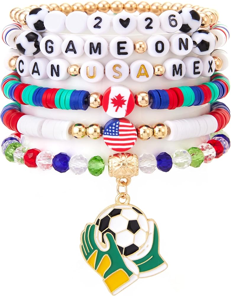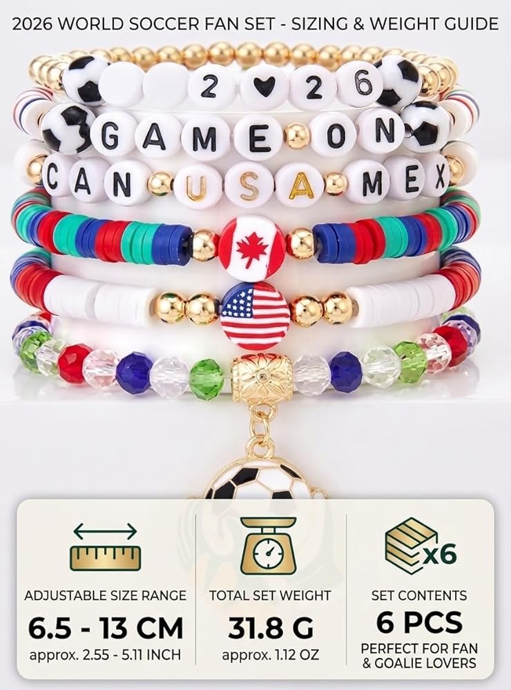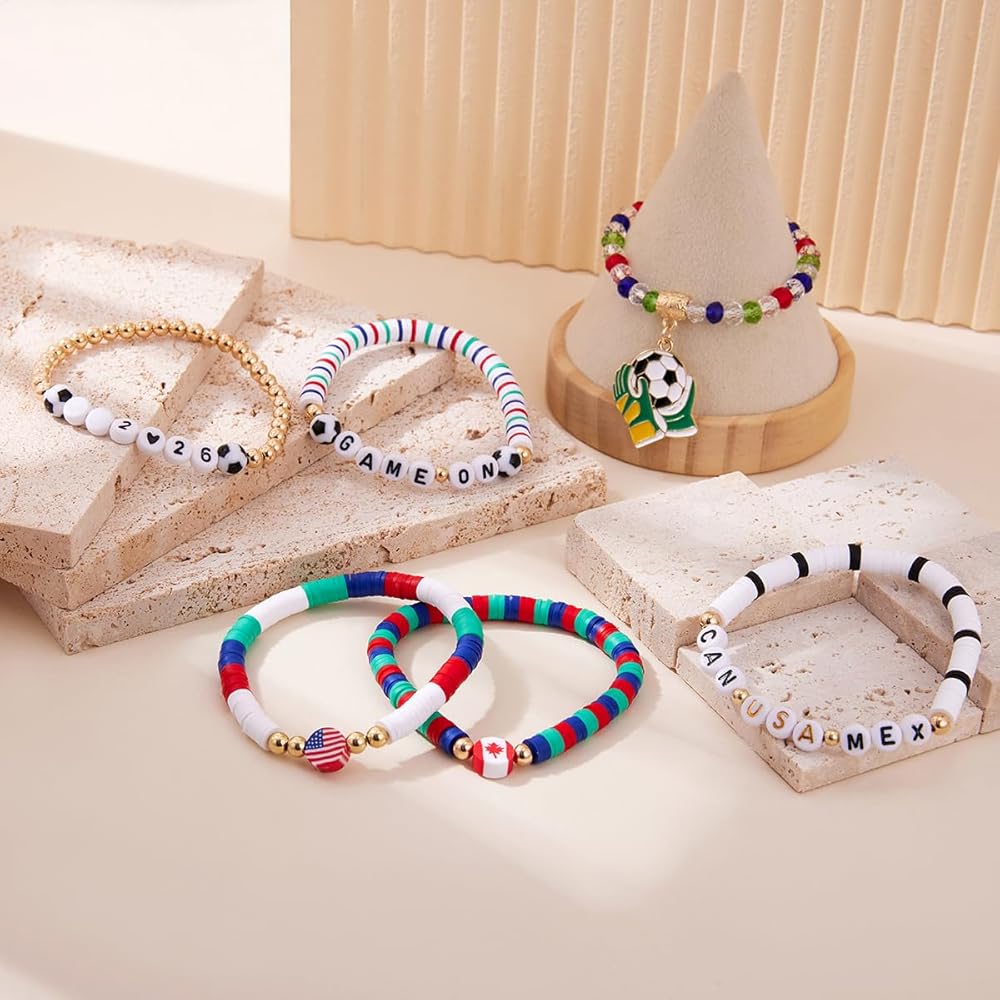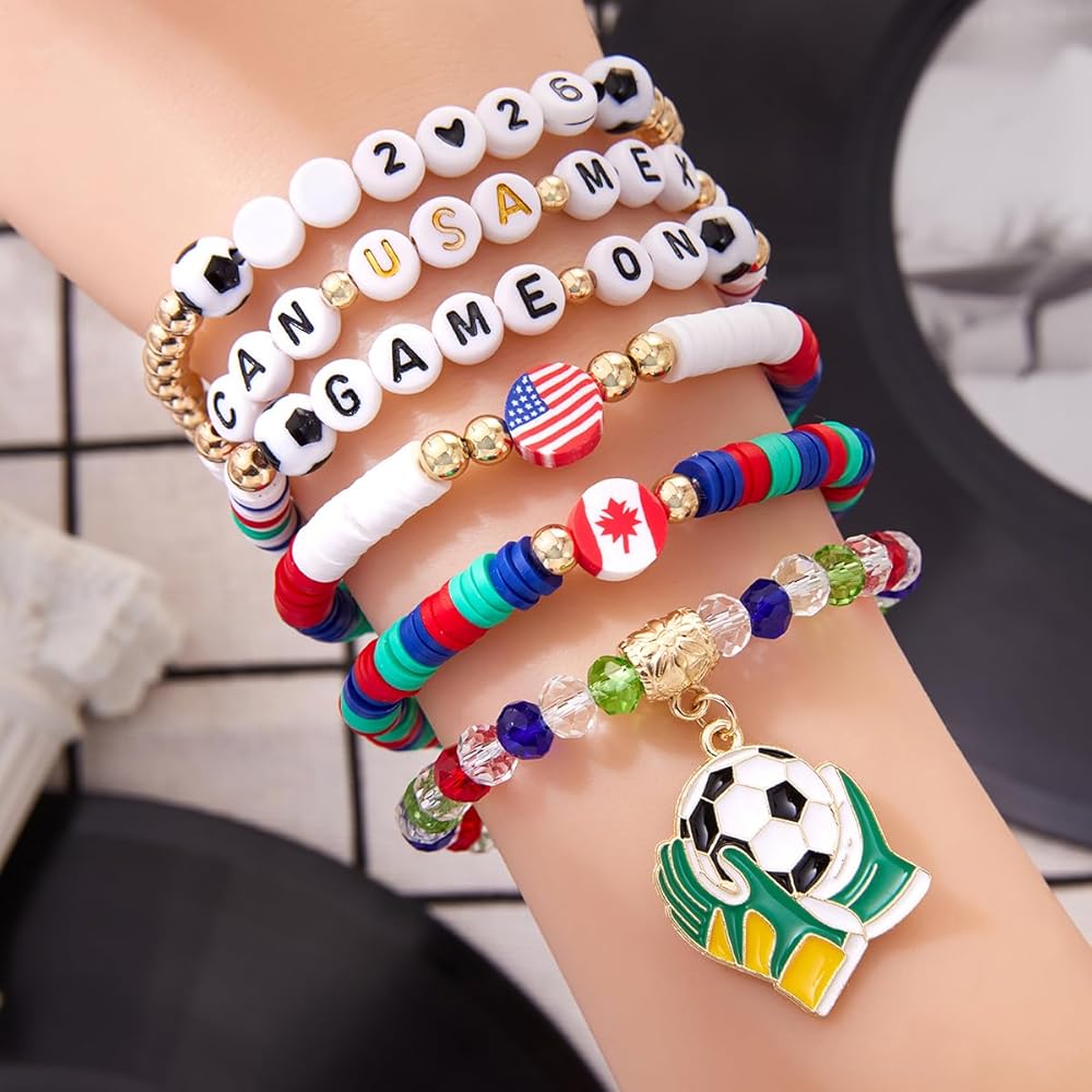 أساور كأس العالم لكرة القدم 2026 - [6] قطع من مجموعة خرز هيشي القابلة للتكديس من CAN USA MEX - إكسسوارات مشجعي كرة القدم وكرة القدم - مجوهرات روح فريق الأمم المضيفة للنساء والفتيات وأمهات كرة القدم