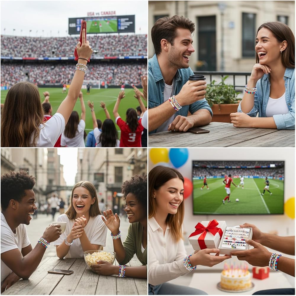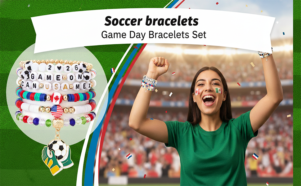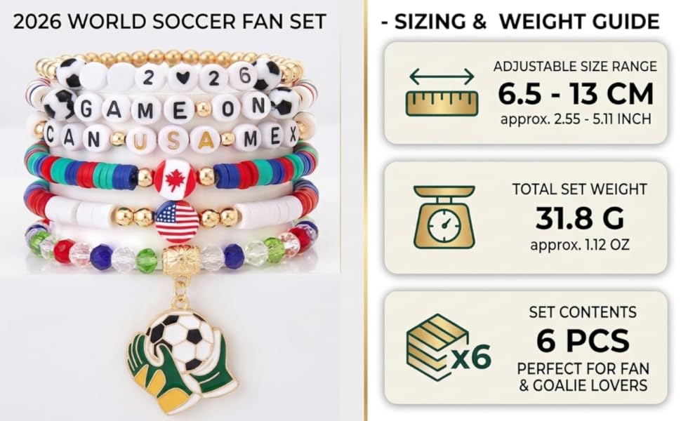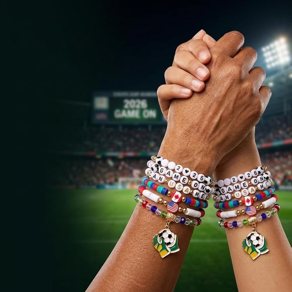 أساور كأس العالم لكرة القدم 2026 - [6] قطع من مجموعة خرز هيشي القابلة للتكديس من CAN USA MEX - إكسسوارات مشجعي كرة القدم وكرة القدم - مجوهرات روح فريق الأمم المضيفة للنساء والفتيات وأمهات كرة القدم