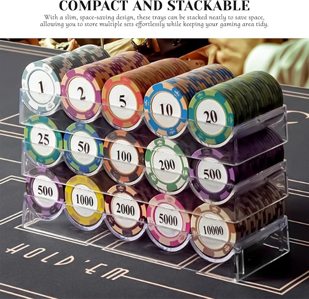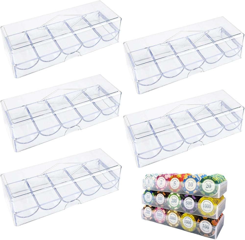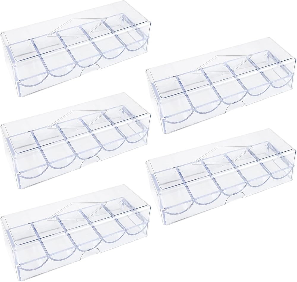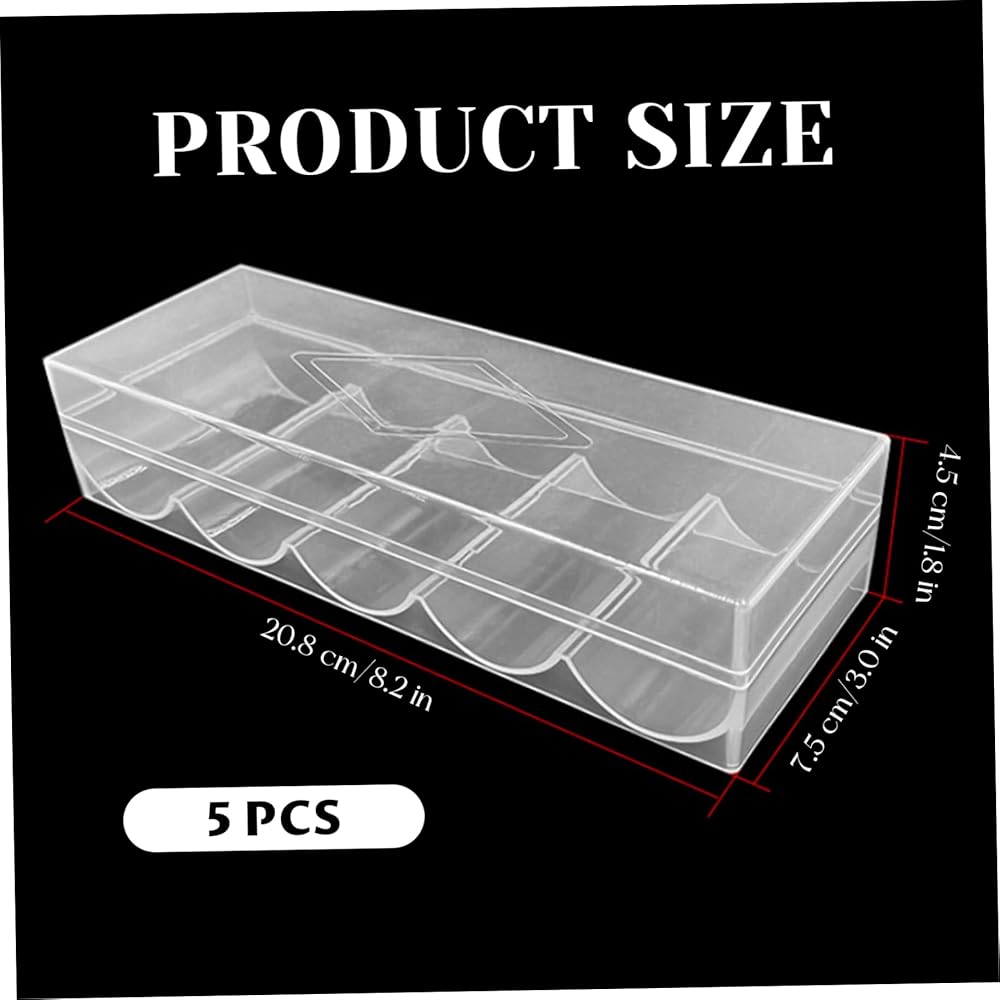 5Pcs Poker Chip Case, Clear Plastic Poker Chip Tray with Lid reliable and transparent storage for poker chips, combining poker chip case, poker chip holder, poker chip tray, poker chip rack, poker case, and poker accessories into a versatile set perfect for gambling, parties, or home use, featuring strong clear plastic construction with secure lids to prevent spillage, compact stackable design for easy organization, and multi-use capacity to store chips or other small items, making it an essential poker accessory to keep your gaming space neat and ready for play.