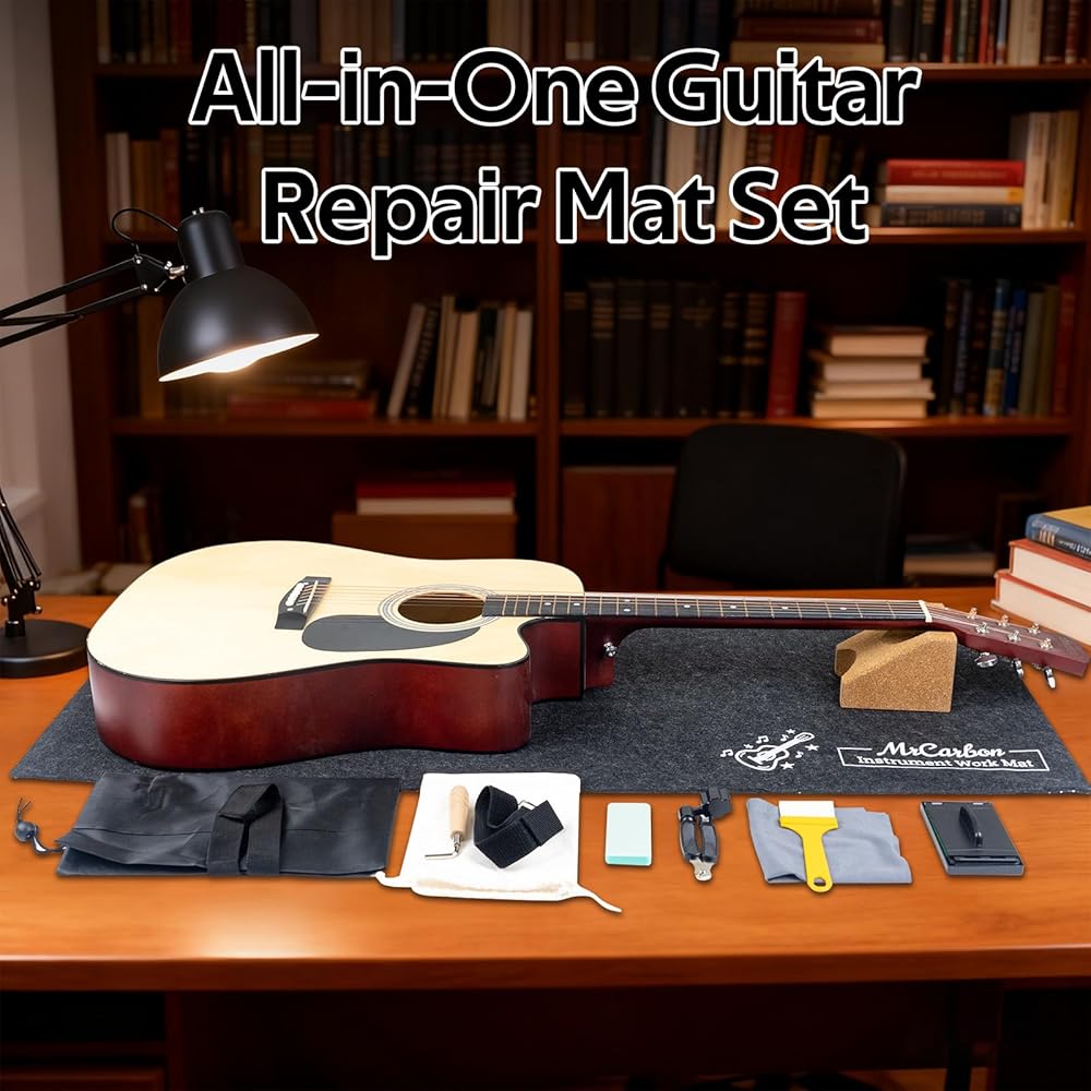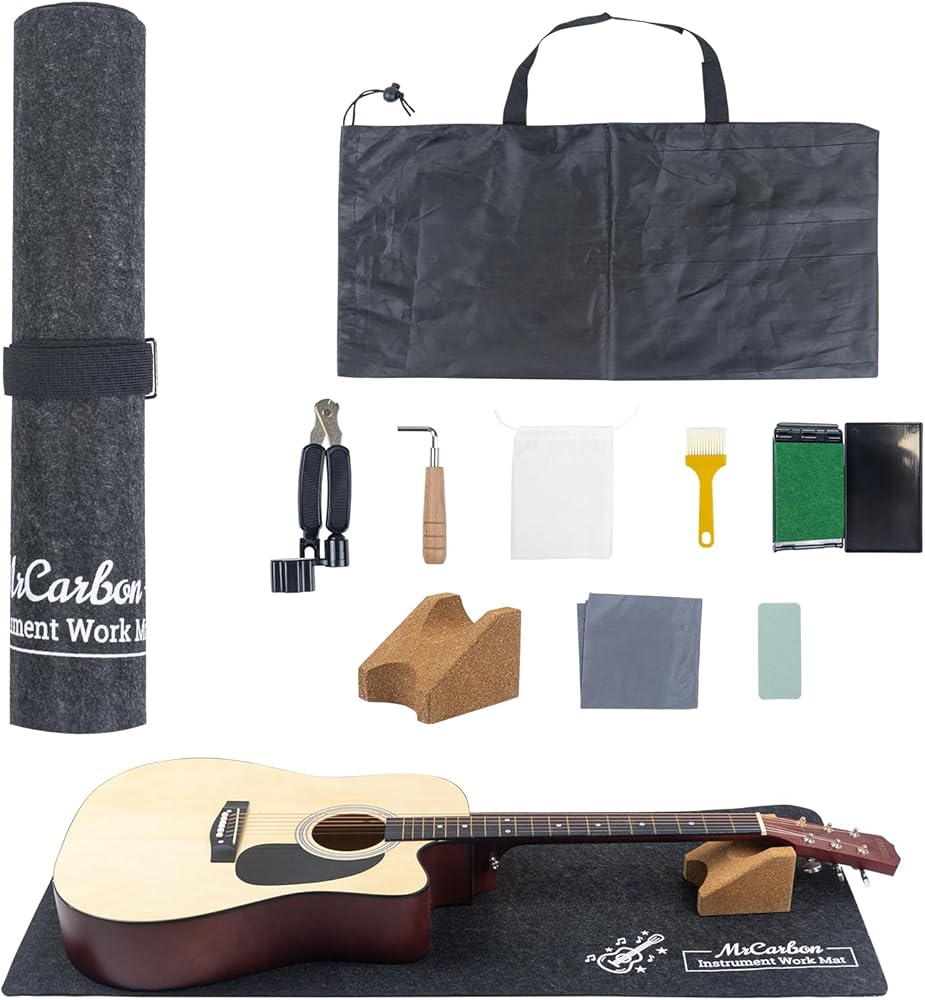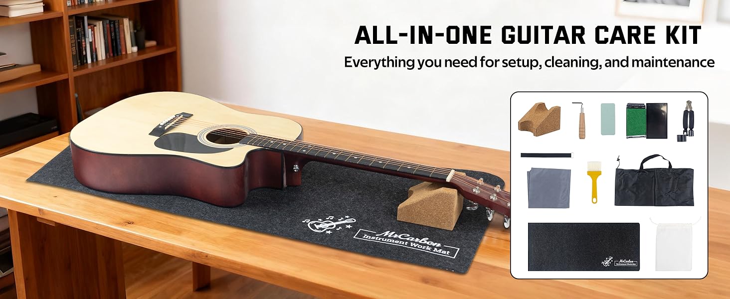 【مجموعة كاملة لصيانة الجيتار】تتضمن سجادة عمل من اللباد، ومسند رقبة الجيتار الفاخر، ولفاف الخيط، وكتلة تلميع الحنق، ومفتاح ربط سداسي لقضيب الجمالون، ومنظف خيط، وفرشاة تنظيف، وقماش تنظيف، وحقيبة مخملية صغيرة، وحقيبة تخزين أكسفورد كبيرة، وحزام ربط - كل ما يلزم للتنظيف وإعادة الضبط والإعداد والعناية الروتينية بالجيتار