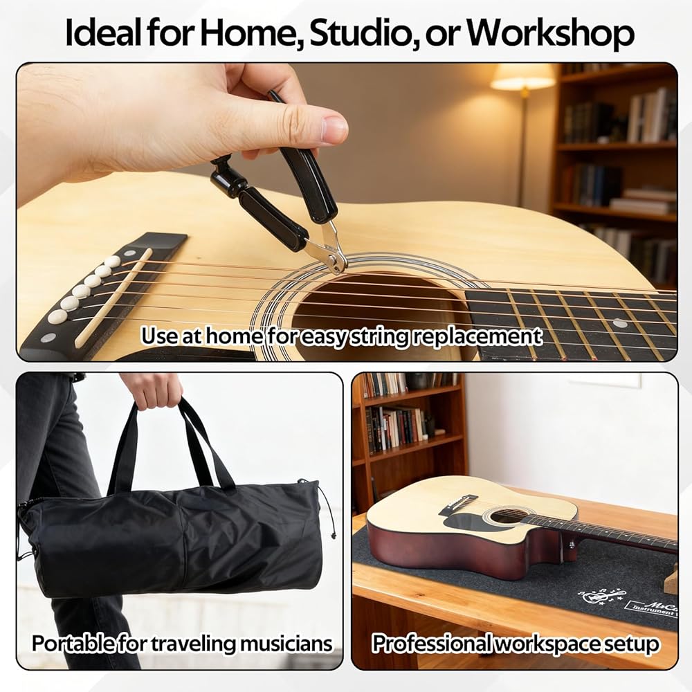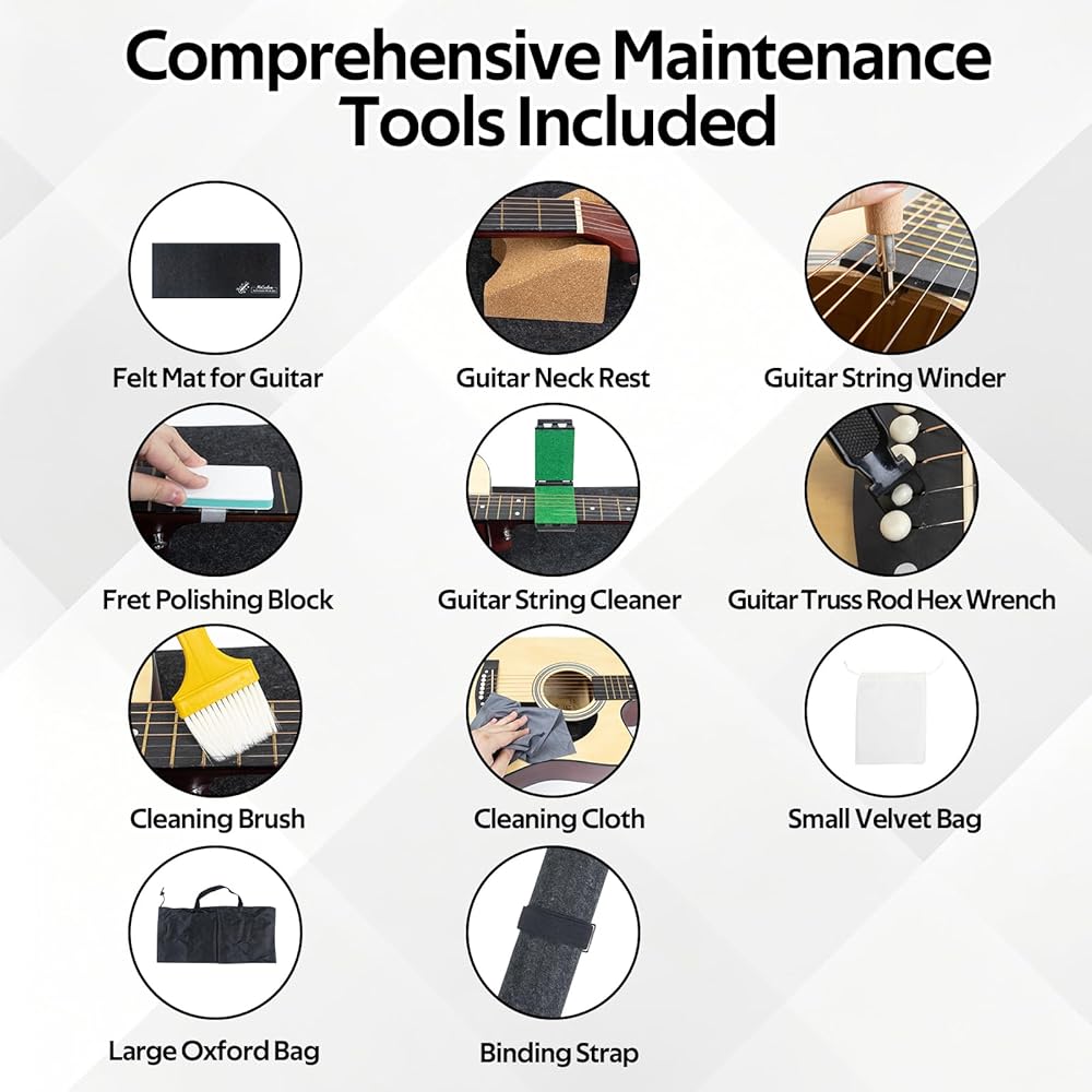 【أدوات فعالة للتنظيف وإعادة الضبط والإعداد】تتضمن لفافة سلسلة متعددة الوظائف، وكتلة تلميع الحنق، ومفتاح ربط سداسي لقضيب الجمالون، ومنظف خيط، وفرشاة، وقماش لمساعدتك على إجراء صيانة سريعة وفعالة - مثالية لاستعادة النغمة، وتحسين القدرة على اللعب، وإطالة عمر جيتارك.