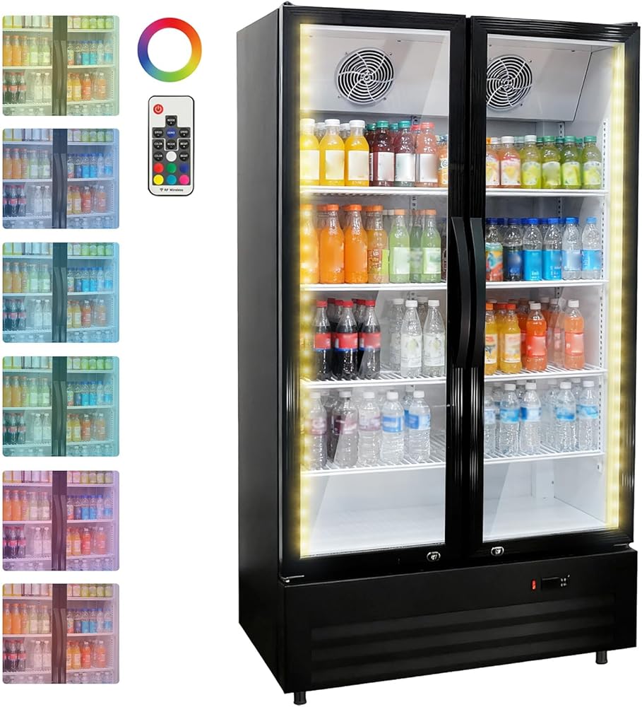 Introducing the 32.5 Cu.ft Double Door Commercial Beverage Cooler, the perfect solution for your bar, restaurant, or supermarket needs. This high-capacity fridge holds up to 580 cans, making it ideal for storing a wide variety of beverages including beer, soda, and other drinks. Featuring a sleek black and silver design with glass doors, it offers excellent visibility to showcase your products while maintaining a professional look.