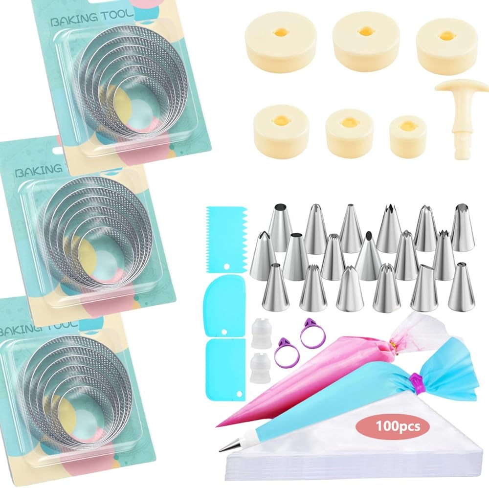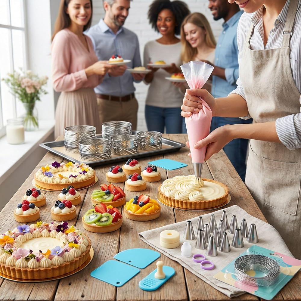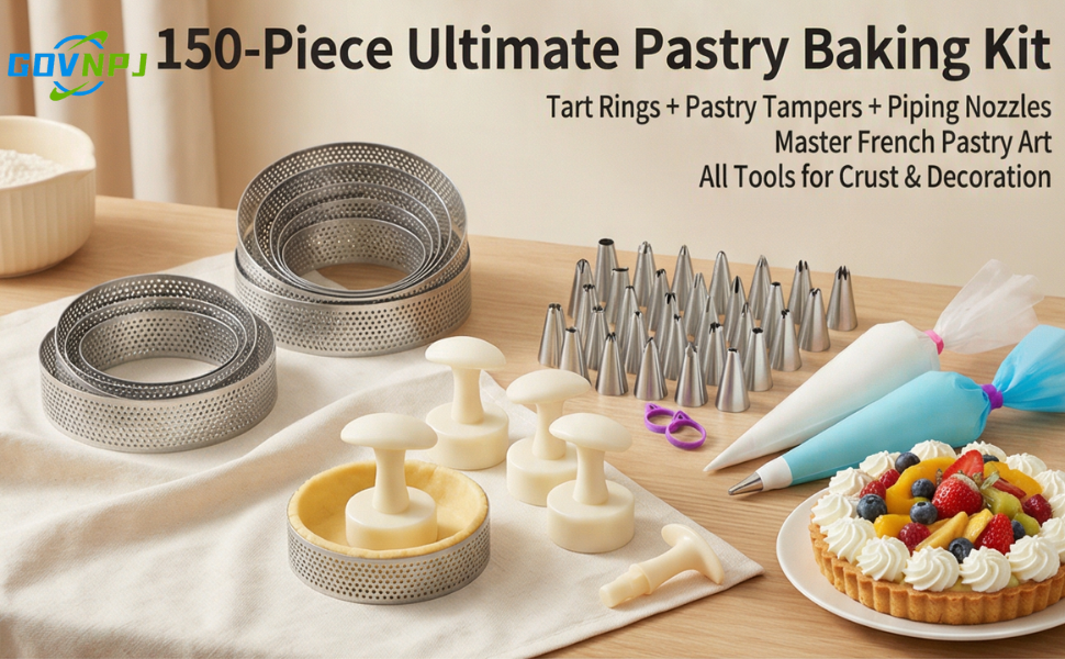 مجموعة خبز التارت الفرنسي، مجموعة مكونة من 150 قطعة، حلقات تارت مثقوبة من الفولاذ المقاوم للصدأ، مع أداة ضغط المعجنات ومجموعة أنابيب مكونة من 126 قطعة، للمخبوزات الاحترافية وهدايا الخبز التي تصنعها بنفسك