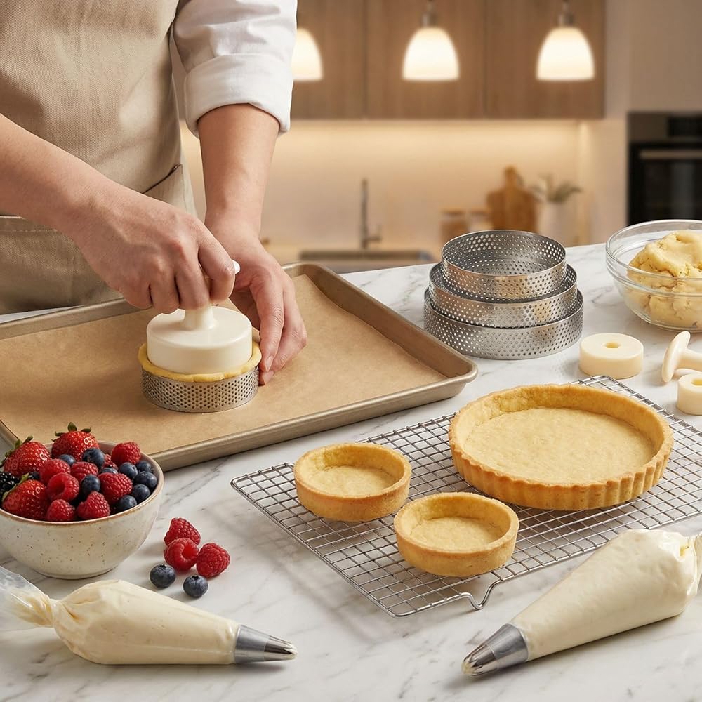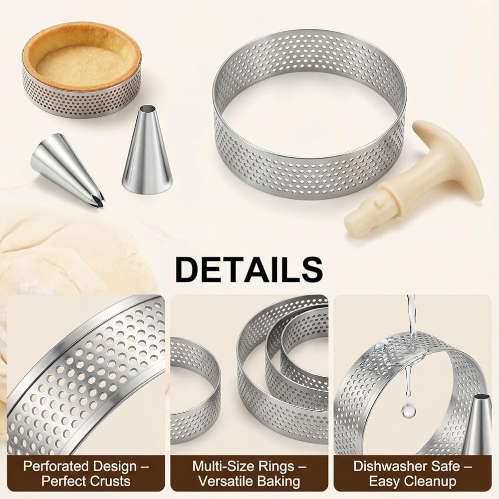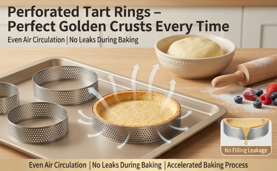 • تصميم مثقوب احترافي لقشور مثالية: تتميز حلقات التارت عالية الجودة بتصميم مثقوب متخصص مع فتحات هواء موزعة بالتساوي تضمن دوران الهواء الأمثل وتمنع التسرب أثناء عملية الخبز. تعمل هذه البنية المتقدمة على تسريع عملية الخبز ومنع الانسكابات، مما يؤدي إلى الحصول على قشرة تورتة مثالية ذات لون بني ذهبي في كل مرة