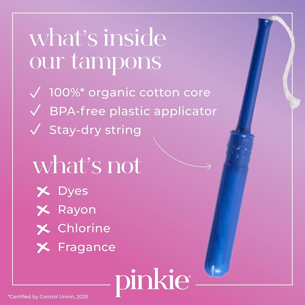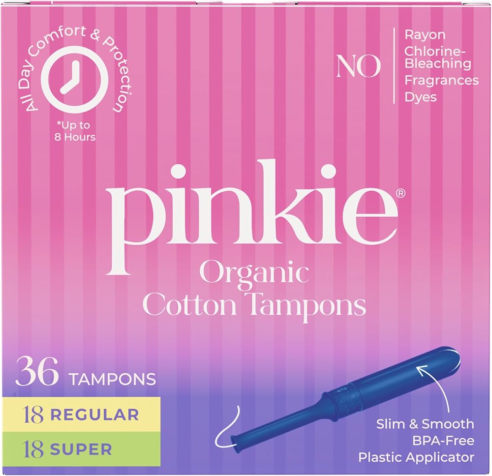 سدادات قطنية عضوية من بينكي للمراهقين والبالغين - مصنوعة من القطن بنسبة 100% تتكيف مع جسمك - أداة توزيع رفيعة خالية من مادة BPA لإدخال مريح - خالية من الكلور والعطور والصبغات والرايون - عادية/ممتازة، 36 قطعة