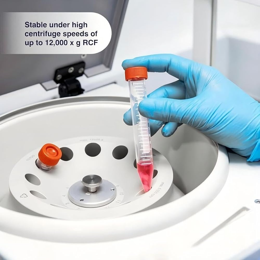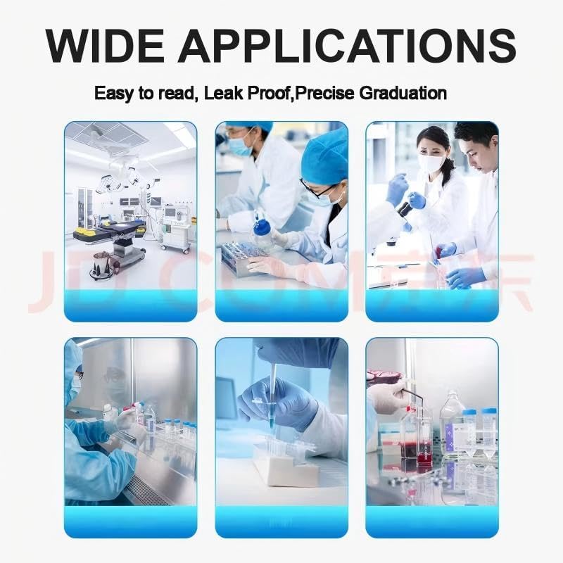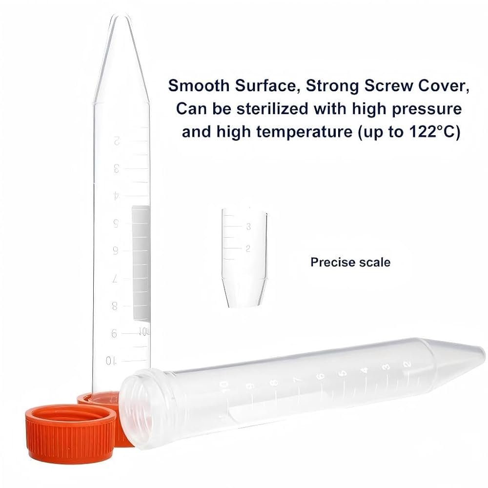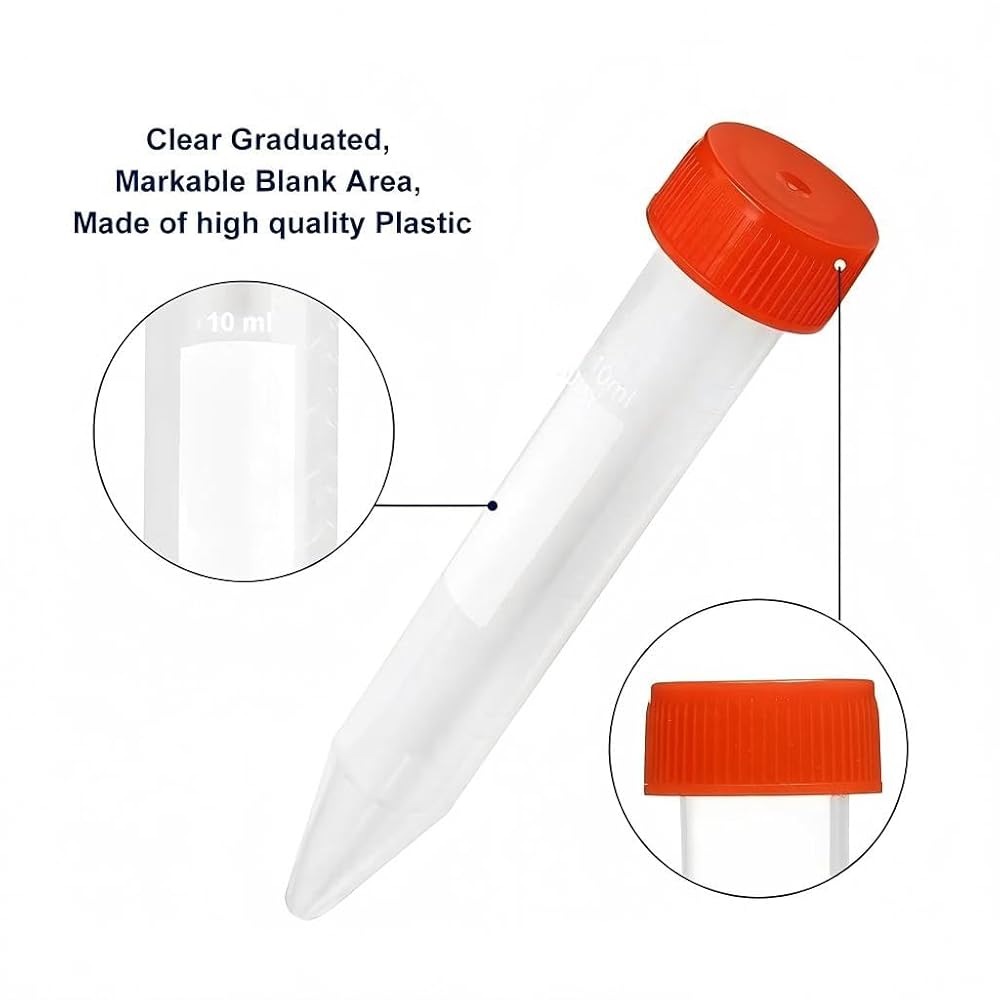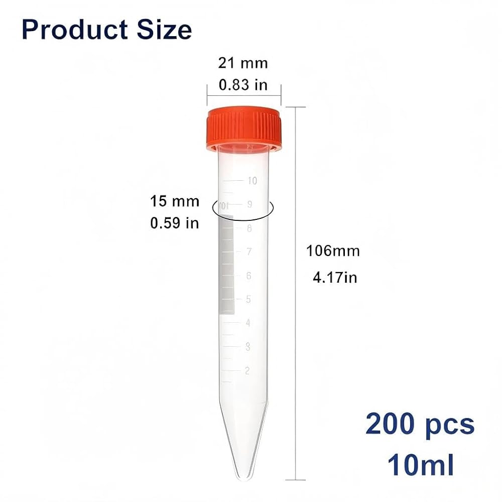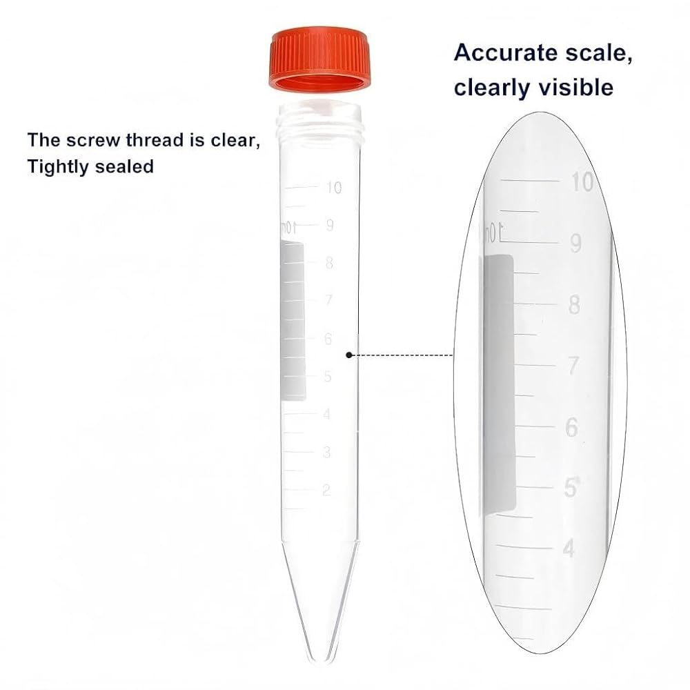 Material: 10 ml Conical bottom centrifuge tube with PP Material, with clear graduated and screw cover, Markable blank area Good sealing: The set includes 200pcs centrifuge tubes. They're simple to fill and the lids fit tight, no leaks Easy to use: Smooth products, good transparency, clear measurement scale, easy to use