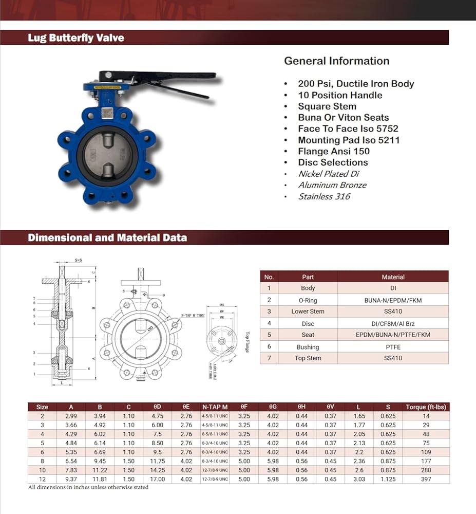 Upgrade your flowline systems with this premium Lug Style Butterfly Valve, engineered for durability and precise flow regulation. Whether situated between two pipe segments for isolation or used for throttling, this valve delivers exceptional value and performance. The unit features a 200 PSI-rated ductile iron body and is fitted with a resilient Buna-N (NBR) seat for a reliable, leak-free seal in various environments. The 10-position locking handle ensures that your flow settings stay exactly where you need them for safe, consistent operation. For proper handle and actuator compatibility, please note that the 2", 3", 4", and 6" valves are equipped with a 5/8" square stem, while the 8" valve features a 7/8" square stem. Note to buyers: Please verify your application's requirements regarding the disc material, as these valves are frequently utilized with Nickel Plated DI, Aluminum Bronze, or Stainless 316 discs depending on your specific operational needs.