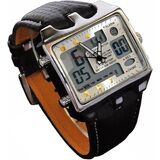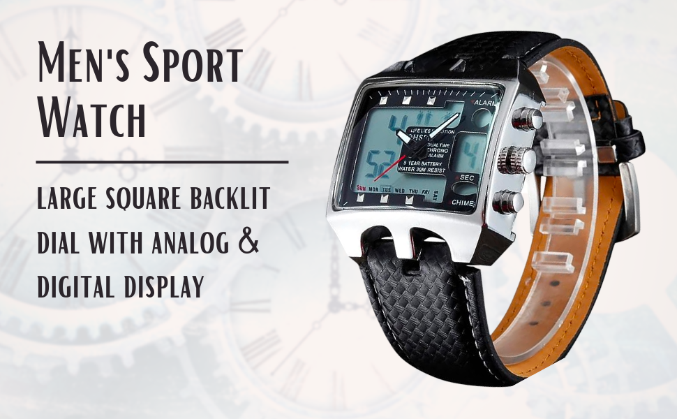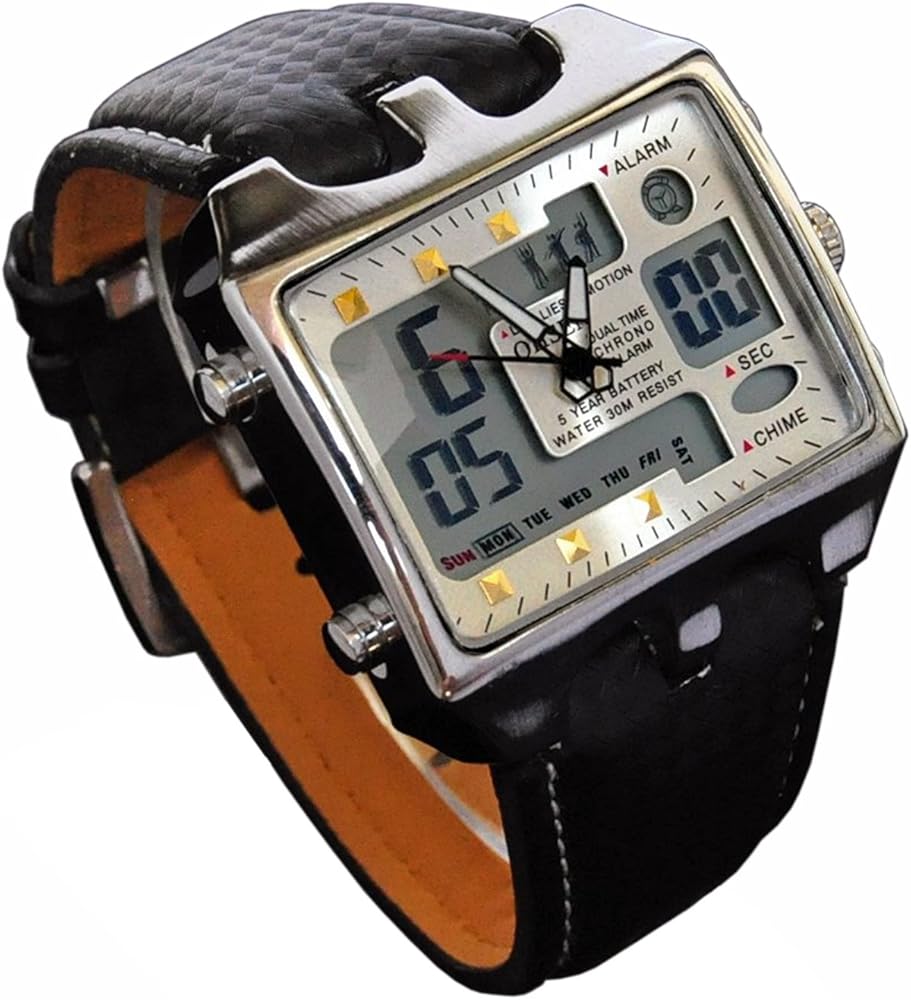 This multifunction digital wrist watch offers a Complete Calendar, an Alarm function with Chimes and a Chronograph Stopwatch. The square dial offers a dual mode Analog and Digital Dual time display with a back light. Whether you are interested in square watches for men, sport digital watches , geek watches or even a gimmick watch for teenage boys you will find that this unique digital watch with hands will fulfill most requirements. The adjustable leather strap of this men's watch will fit a wrist circumference of 6.5 inches to a maximum of 9 inches