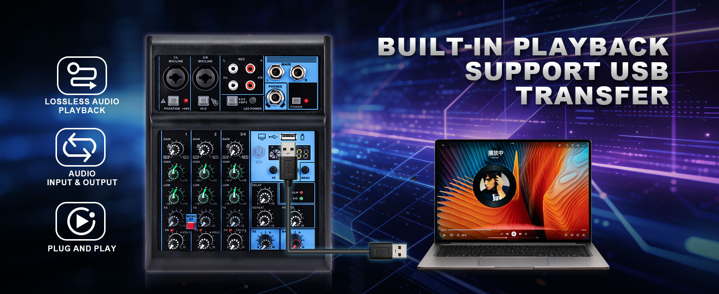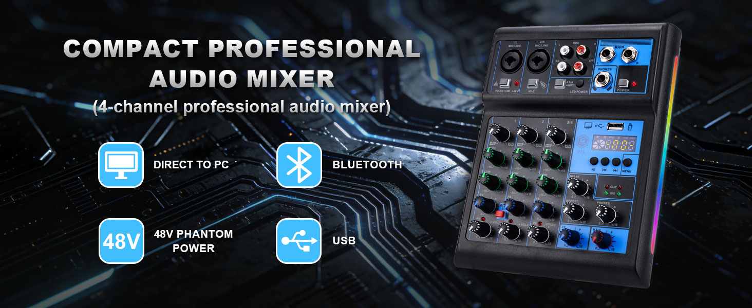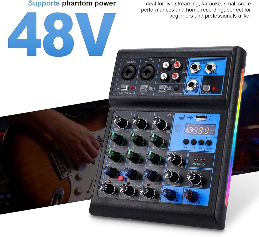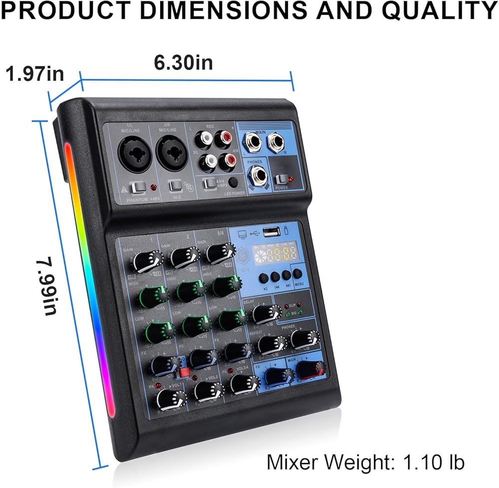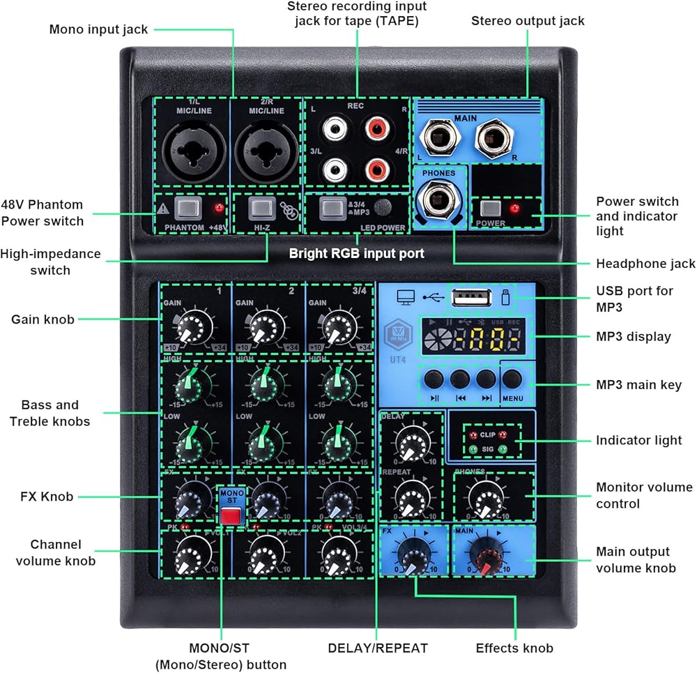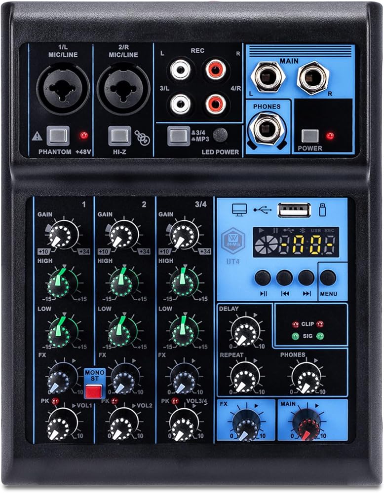 خلاط W IN-MIX الاحترافي ذو 4 قنوات مع بلوتوث وتسجيل USB وطاقة فانتوم 48 فولت - وحدة تحكم صوتية للاستوديو والبث المباشر للدي جي والكاريوكي والبث