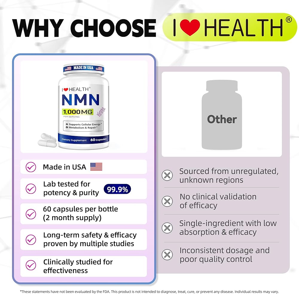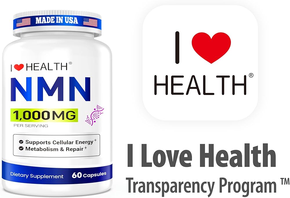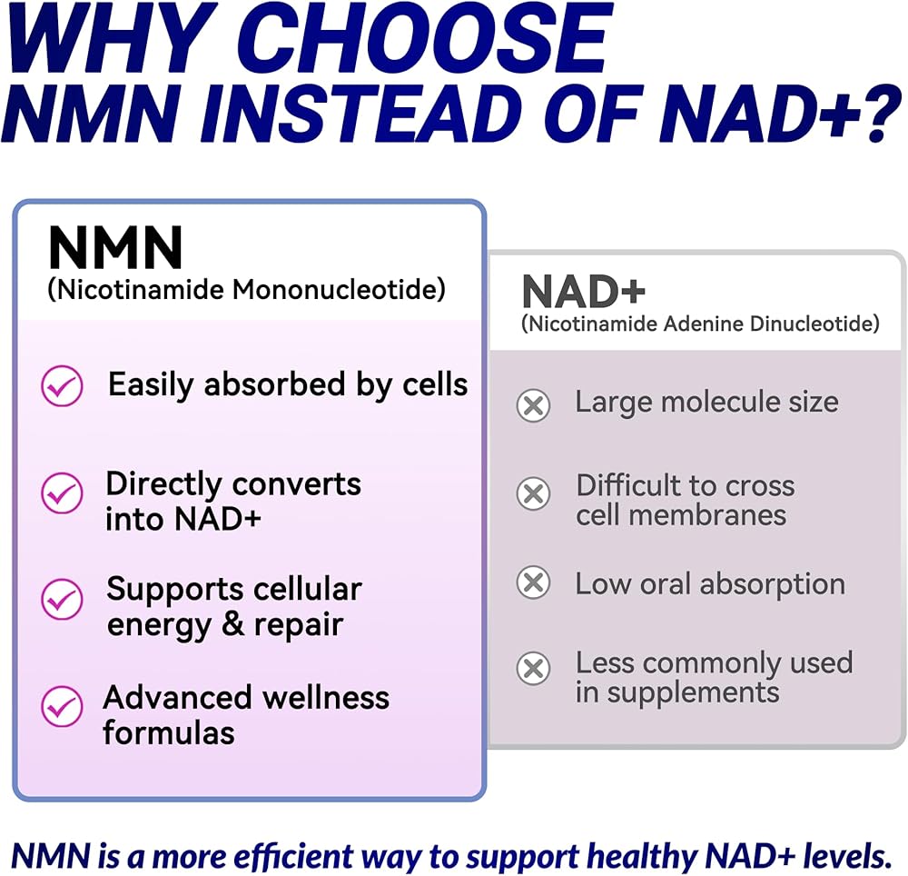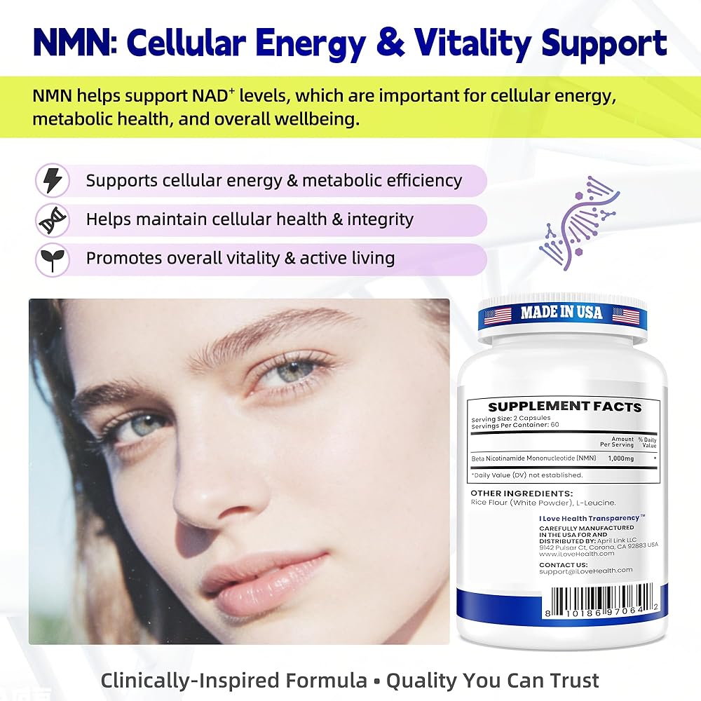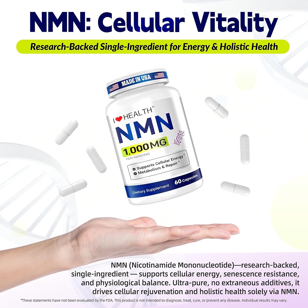 مكمل NMN 1000 ملغ لكل حصة، 99.9% أحادي نيوكليوتيد النيكوتيناميد النقي، NAD+ يدعم الطاقة الخلوية والشيخوخة الصحية للرجال والنساء، 60 كبسولة (كمية تكفي لمدة 30 يومًا)، تم اختباره من قبل طرف ثالث، cGMP