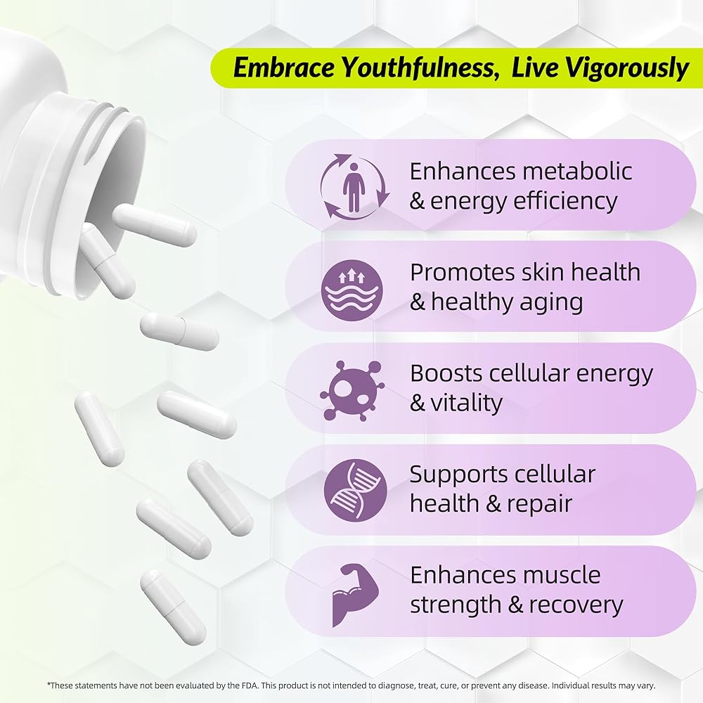 كمية تكفي لمدة 30 يومًا - روتين يومي بسيط للعناية بالصحة، تحتوي كل زجاجة على 60 كبسولة (30 حصة). ما عليك سوى تناول كبسولتين يوميًا مع الطعام أو بدونه لدعم مستويات NAD+ لديك والصحة العامة. إضافة مريحة ومدعومة علميًا لنظامك الصحي اليومي للحصول على دعم خلوي طويل الأمد