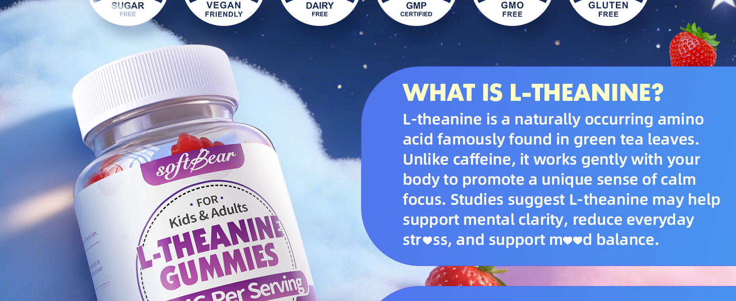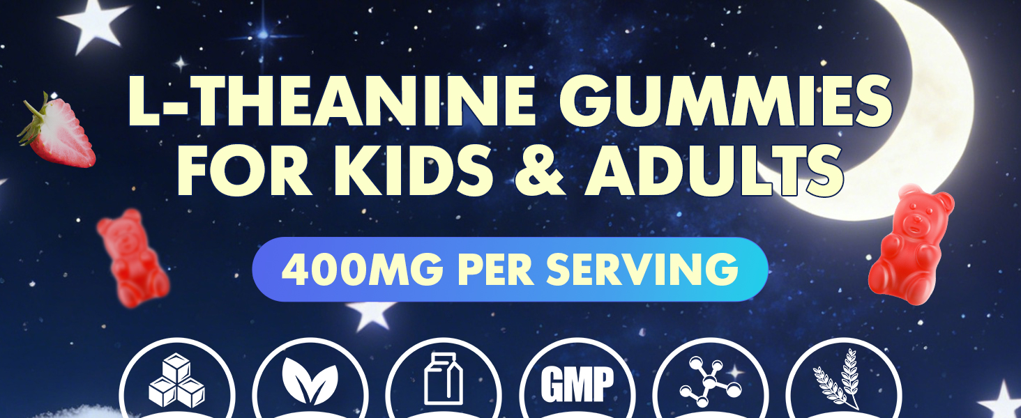 L-Theanine Gummies 400mg: توفر علكات مكملات l-theanine الخاصة بنا 400mg من l-theanine لكل وجبة، جنبًا إلى جنب مع أشواغاندا، بلسم الليمون، الجابا، 5-htp وفيتامين ب 6 - مما يجعلها خيارًا مثاليًا للعافية اليومية.