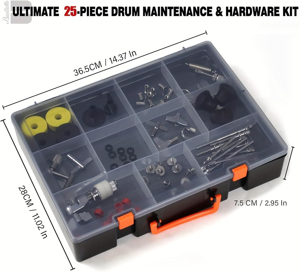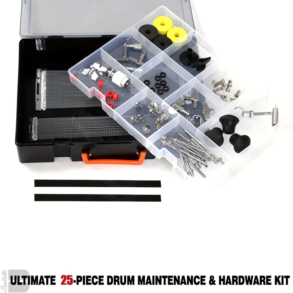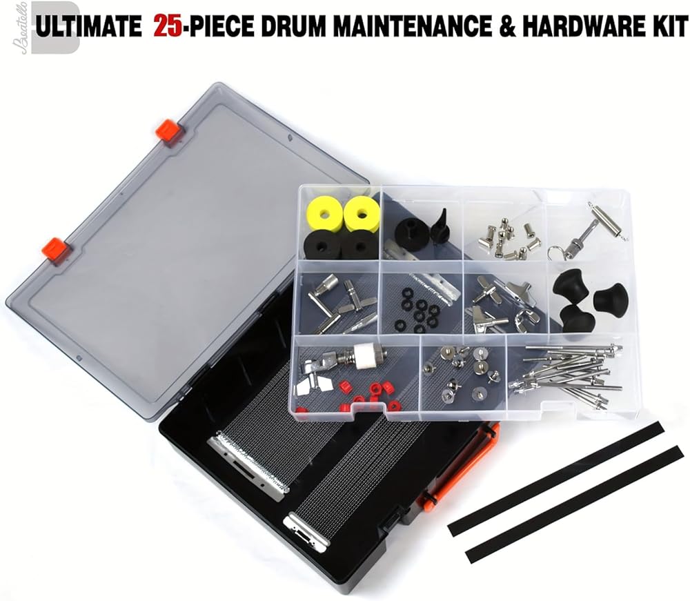 Stay ready for anything with this all-in-one Drum Accessory Kit, featuring 71 high-quality pieces in a portable and durable suitcase. From essential components like snare wires, drum screws, cymbal felts, and rubber foot pads, to tools like standard and power drill drum keys, this set is engineered to cover the everyday maintenance and emergency repair needs of any drummer. The included gig-ready suitcase is crafted from tough, impact-resistant plastic that safeguards your gear from wear and tear. Each component inside is made from premium materials—rust-resistant steel, sturdy metal alloys, and durable rubber—ensuring long-term reliability. Whether you're tuning up before a show or fixing gear on the fly, this compact kit helps you stay organized, efficient, and ready to play. No more lost parts, broken equipment, or last-minute panic. With this comprehensive drum hardware set, you've got every base covered.