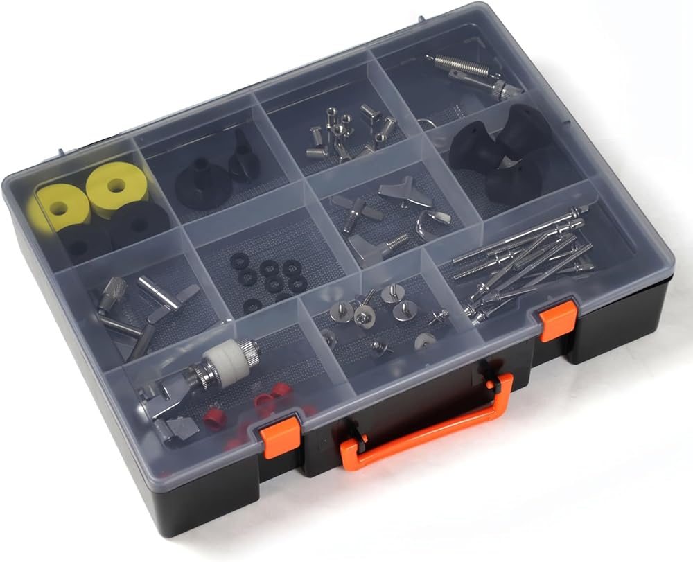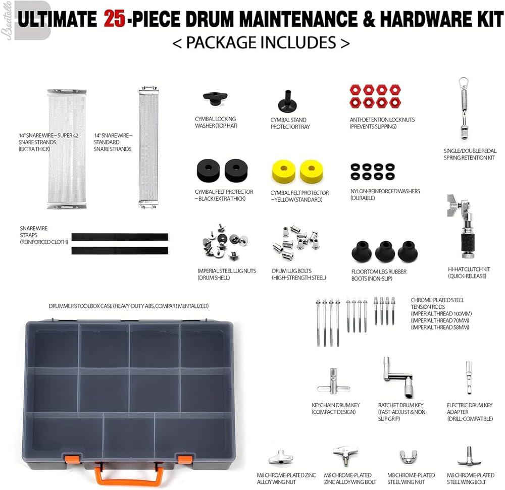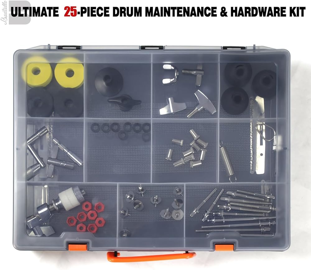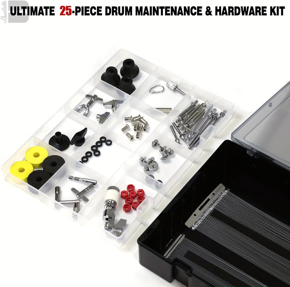 Stay ready for anything with this all-in-one Drum Accessory Kit, featuring 71 high-quality pieces in a portable and durable suitcase. From essential components like snare wires, drum screws, cymbal felts, and rubber foot pads, to tools like standard and power drill drum keys, this set is engineered to cover the everyday maintenance and emergency repair needs of any drummer. The included gig-ready suitcase is crafted from tough, impact-resistant plastic that safeguards your gear from wear and tear. Each component inside is made from premium materials—rust-resistant steel, sturdy metal alloys, and durable rubber—ensuring long-term reliability. Whether you're tuning up before a show or fixing gear on the fly, this compact kit helps you stay organized, efficient, and ready to play. No more lost parts, broken equipment, or last-minute panic. With this comprehensive drum hardware set, you've got every base covered.
