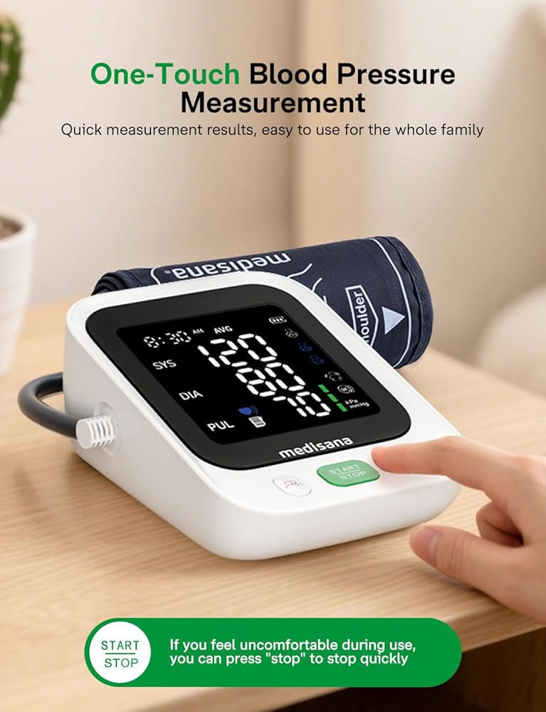 تحكم بزر واحد لمراقبة صحة الأسرة: يمكن لجهاز مراقبة ضغط الدم Medisana البدء بسهولة في قياس ضغط الدم والنبض بنقرة واحدة فقط على البدء. اضغط على زر MEU لتتبع بيانات ضغط الدم لعرض السجل. فهو يلتقط حركات الجسم ويطالبك بوضعية الاختبار الصحيحة. ويمكنه أيضًا اكتشاف عدم انتظام ضربات القلب تلقائيًا وإظهاره على الشاشة. إذا كان هناك أي إزعاج، اضغط على زر الإيقاف في الوقت المناسب لإيقاف القياس على الفور