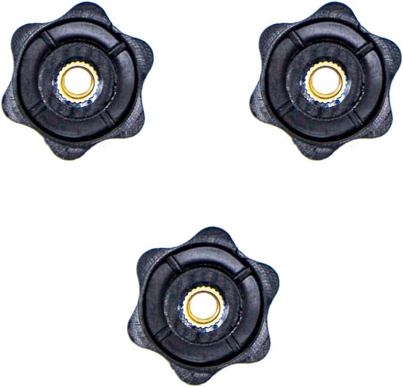 Each knob consists of a plastic star-shaped knob with attached brass insert. The thru knobs screws have no edges or burrs.