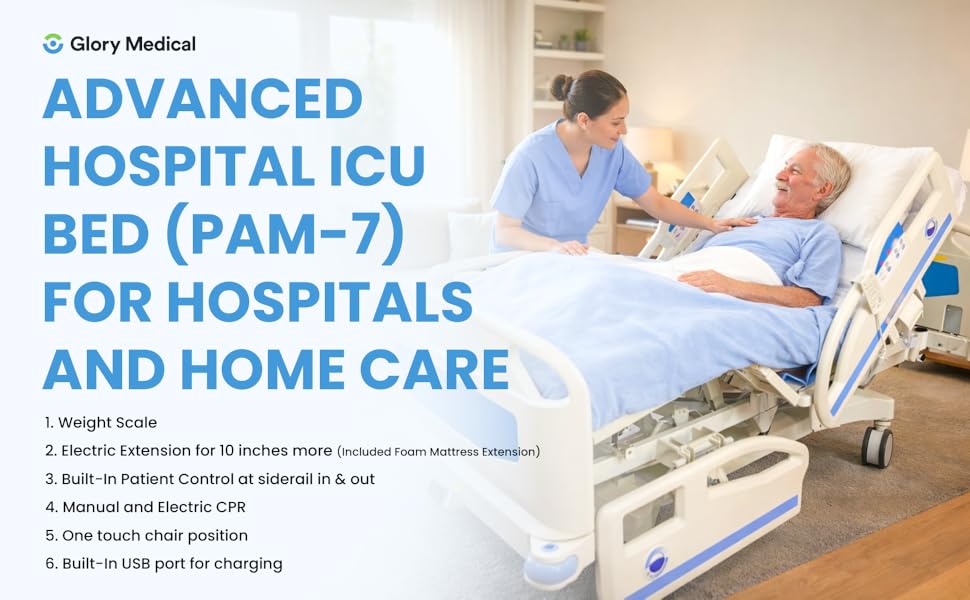 سرير العناية المركزة للمستشفى PAM-7 من Glory Medical للرعاية التجارية/المنزلية، مقياس وزن مدمج، امتداد 10 بوصة، إنعاش قلبي رئوي يدوي/كهربائي، تحكم المستخدم في الجانب الجانبي، قفل مركزي، مرتبة هوائية هجينة مقاس 7 بوصات