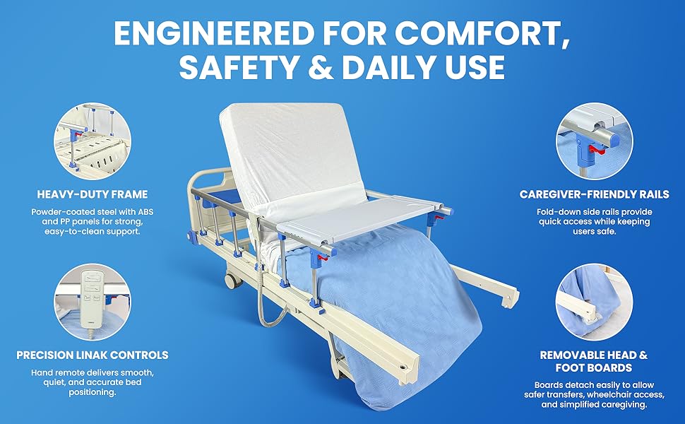 سرير كهربائي مناسب للكراسي المتحركة - الدخول والخروج من نهاية القدم يجعل عمليات النقل سهلة للمستخدمين ومقدمي الرعاية. يوفر لوح القدم القابل للإزالة إمكانية الوصول دون عبور القضبان الجانبية، وهو مثالي للكراسي المتحركة.