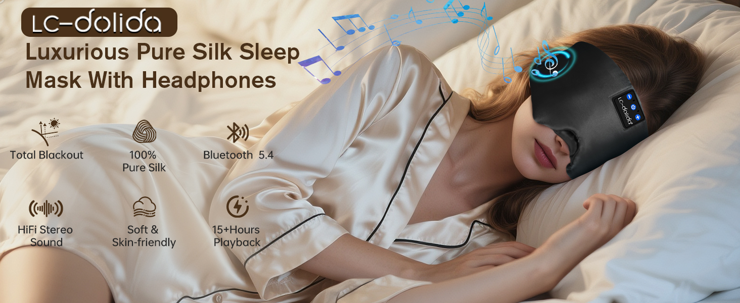 قناع النوم الفاخر - المحبوب من قبل المشاهير والمطلعين على عالم التجميل: انغمس في تجربة النوم المثالية مع قناع النوم الحريري الحائز على جائزة LC-dolida - الخيار الأفضل لمحرري التجميل والمؤثرين والباحثين عن الرفاهية في جميع أنحاء العالم. سماعات الرأس بلوتوث للنوم مصنوعة من الحرير المبطن الفاخر، وهي تحتضن عينيك بلطف، وتحجب الضوء بنسبة 99.99% من أجل راحة أعمق ومتواصلة. يساعد النسيج فائق النعومة وجيد التهوية على تقليل خطوط النوم مع الحفاظ على انتعاشك وراحتك طوال الليل