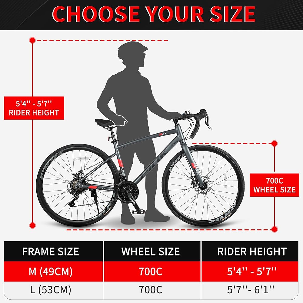 محارب الطريق الفوري: تم تصميمه مسبقًا بنسبة 95% للتجميع السريع. مقاسان للإطار يلائم الدراجين من 5'4 بوصة إلى 6'1 بوصة. قم بفك العلبة، وقم بتوصيل المقود، والعجلة، والمقعد، والدواسات، ثم قم بالقيادة خلال 15 دقيقة