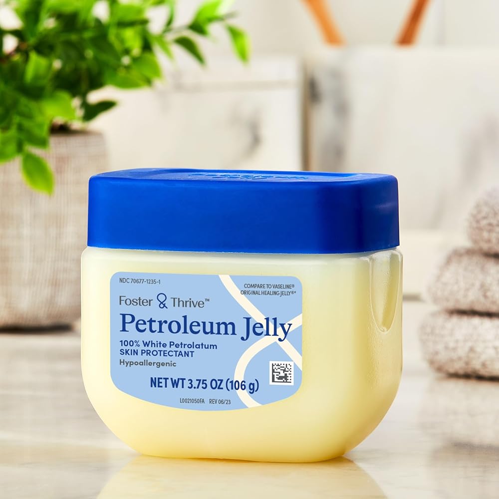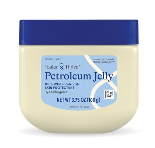 Foster and Thrive Petroleum Jelly Skin Protectant is a skin care product designed for daily external use. Each jar contains 3.75 ounces, and this listing includes 4 jars for a total of 15 ounces. The fragrance-free formula comes in a petroleum jelly texture that supports smooth application and moisture-sealing coverage on targeted skin areas. Its compact jar design is convenient for placement in bathroom cabinets, drawers, desks, or personal care kits. The 4-pack format is practical for home storage, travel packing, or keeping supplies in multiple locations.