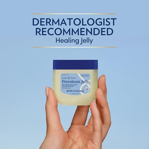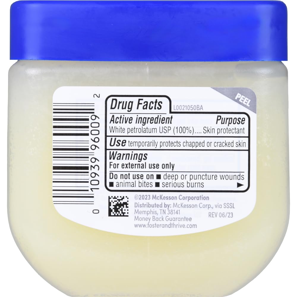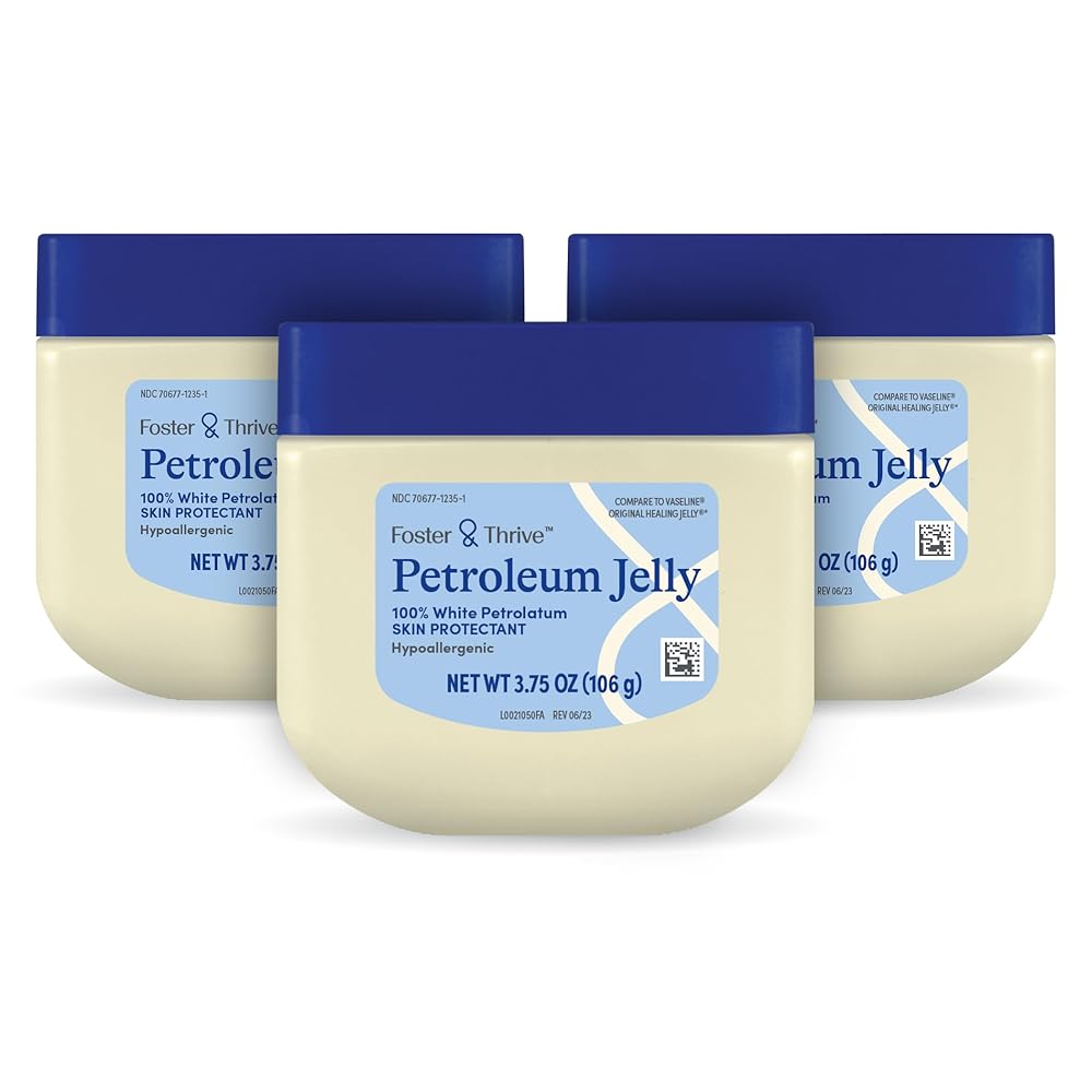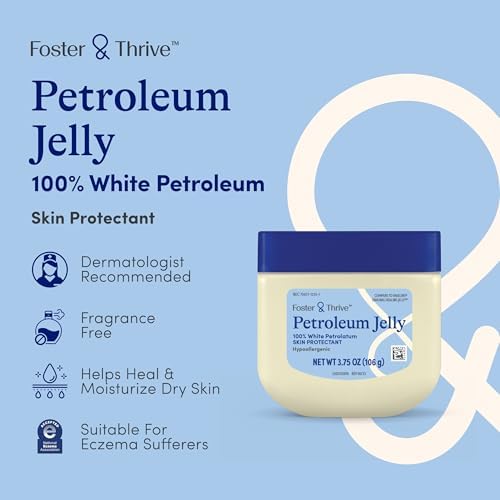 FOSTER & THRIVE 100% PURE PETROLEUM JELLY - MOISTURIZING SKIN PROTECTANT FOR MINOR CUTS AND DRY SKIN. Are dry, cracked skin and minor cuts putting a damper on your day? If you need a reliable solution to soothe and protect your skin against: - Cracks and dryness - Minor cuts and scrapes - Chapped lips or skin ... the Foster & Thrive 3.75 ounce jar of petroleum jelly has you covered. VERSATILE SKIN PROTECTANT FOR EVERYDAY USE Expertly crafted to provide instant relief and protection, this petroleum jelly is your go-to solution for various skincare needs. Whether you're battling dryness on your: * Feet * Elbows * Face ... or any other part of your body, our petroleum jelly will leave your skin feeling nourished and rejuvenated. TEMPORARY RELIEF FOR A RANGE OF SKIN ISSUESFrom cracked hands to chapped lips, Foster & Thrive Petroleum Jelly offers versatile protection against everyday skin woes. Made with 100% pure ingredients, our formula is gentle yet effective, providing temporary relief from discomfort caused by dryness and minor skin irritations. DIRECTIONS FOR USE: This easy-to-apply petroleum jelly is safe for all ages: >- Apply as needed to dry or cracked skin. - For minor cuts or scrapes, clean the area and apply a thin layer of petroleum jelly. - Keep the outer packaging for complete product information and precautions. * 3.75 ounces per jar * Compare to Vaseline 100% Pure Petroleum JellyKEEP YOUR SKIN MOISTURIZED AND PROTECTED WITH FOSTER & THRIVE PETROLEUM JELLY. ORDER YOURS TODAY AND EXPERIENCE INSTANT RELIEF WHEREVER YOU NEED IT!