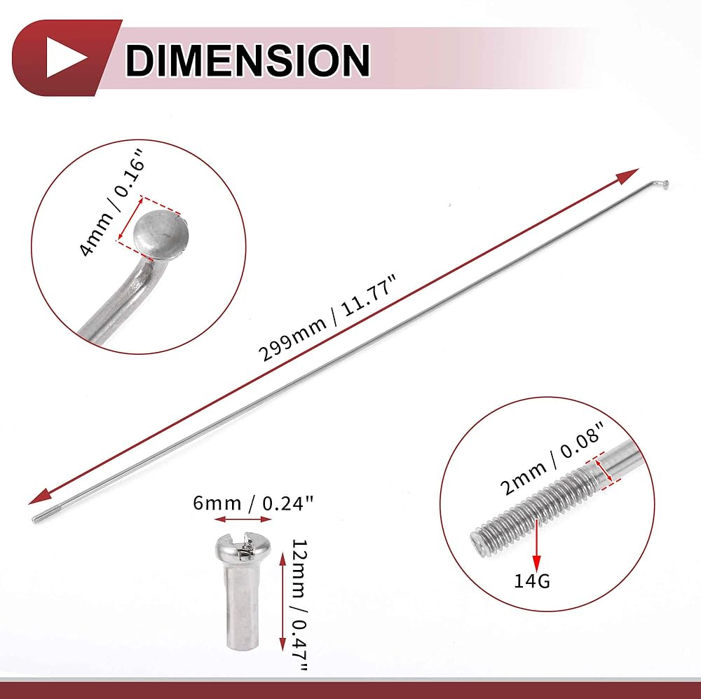 مواصفات المتحدث: حجم الخيط: 14G؛ مادة التحدث: 304 الفولاذ المقاوم للصدأ؛ اللون: لون فضي؛ قطر المتحدث: 2 مم / 0.08 بوصة؛ قطر الكوع المتحدث: 4 مم / 0.16 بوصة؛ طول المتحدث (بدون الكوع): 299 ملم / 11.77 بوصة؛ مقاس خيط الحلمة المتحدث: 14 جرام؛ مادة الحلمة المتحدثة: نحاس؛ قطر الحلمة المتحدثة: 6 ملم / 0.24 بوصة؛ طول الحلمة: 12 ملم / 0.47 بوصة