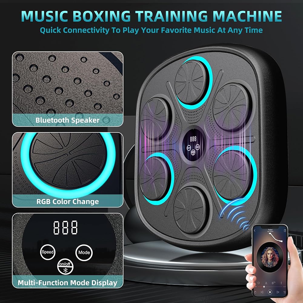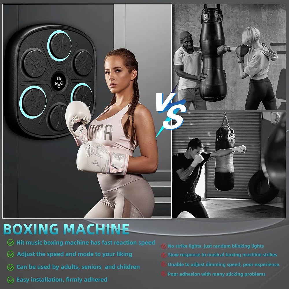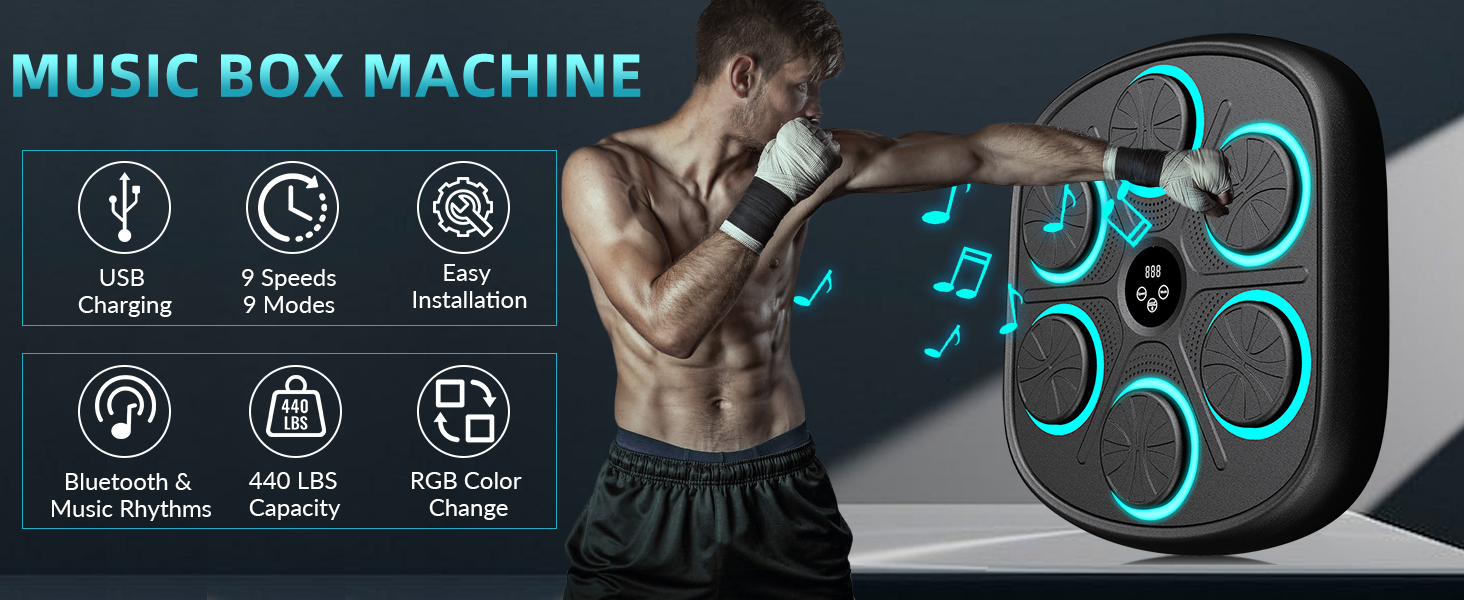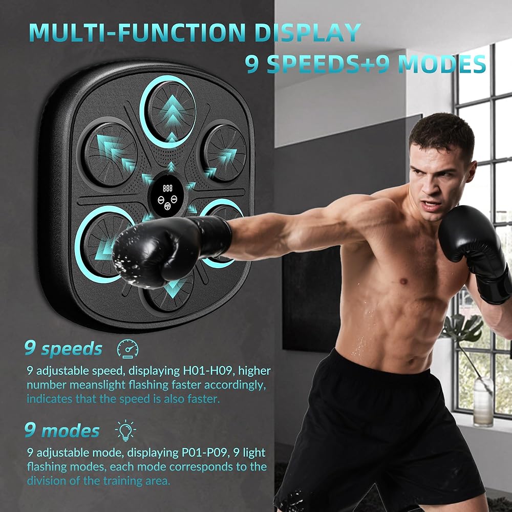 آلة الملاكمة الموسيقية الذكية: تحتوي آلة الملاكمة الموسيقية المثبتة على الحائط على 9 أوضاع و9 سرعات لتلبية احتياجات معظم الأشخاص. تعمل آلة اللكم على تحسين وقت رد الفعل وتنسيق الجسم للملاكمين المحترفين ومتبعي الحمية الغذائية والأطفال وتقليل التوتر ومتعة الأسرة