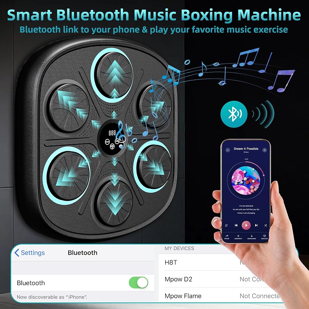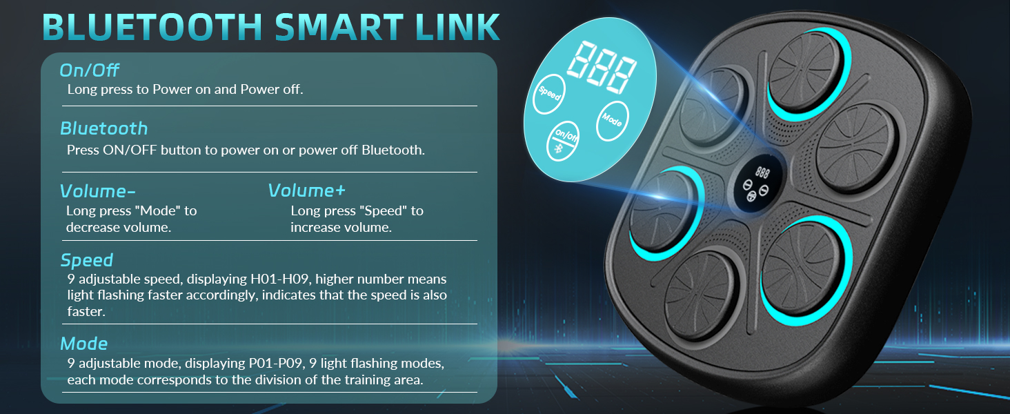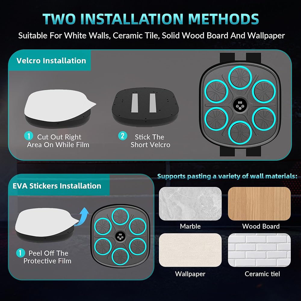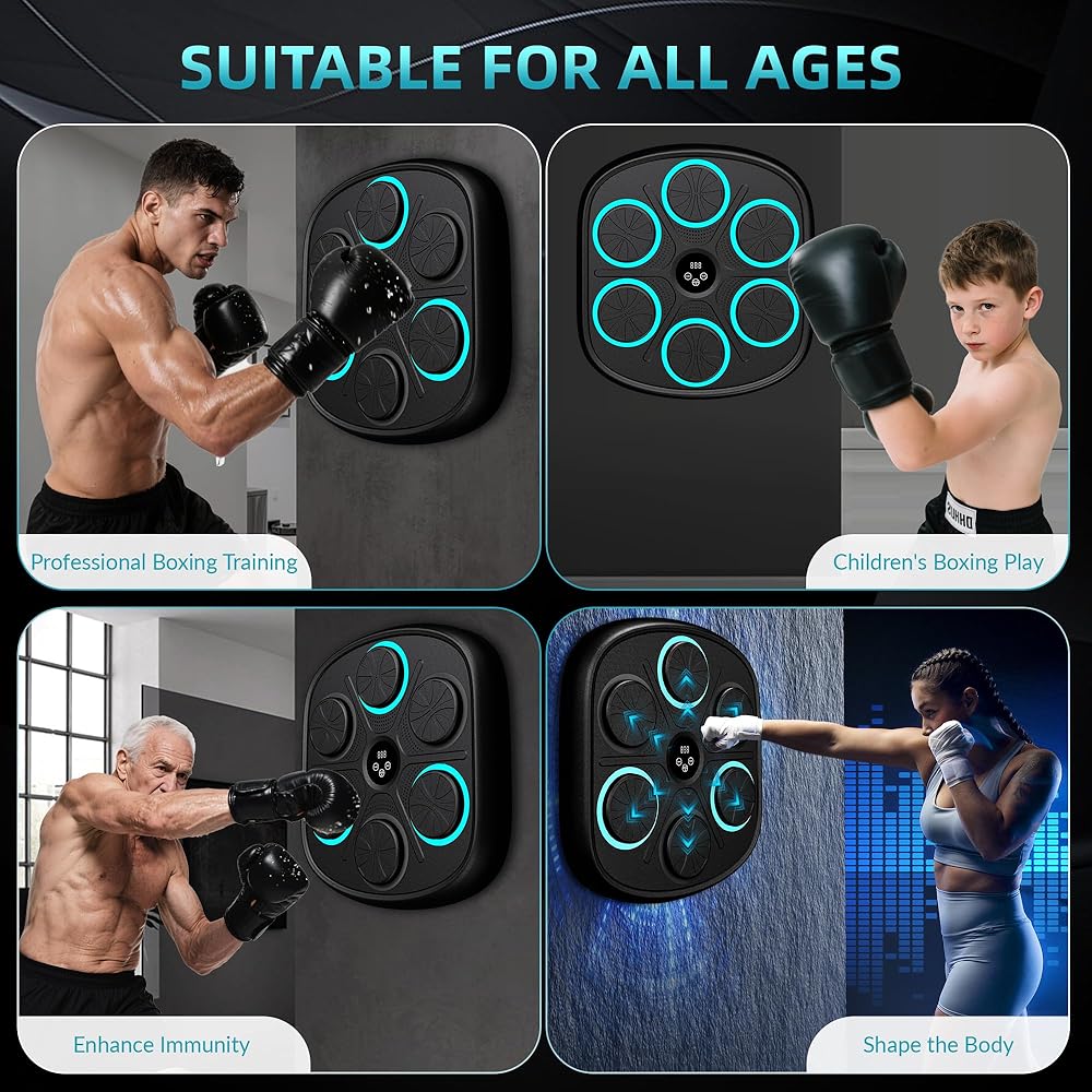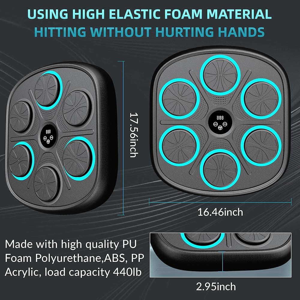 آلة الملاكمة الموسيقية الذكية: تحتوي آلة الملاكمة الموسيقية المثبتة على الحائط على 9 أوضاع و9 سرعات لتلبية احتياجات معظم الأشخاص. تعمل آلة اللكم على تحسين وقت رد الفعل وتنسيق الجسم للملاكمين المحترفين ومتبعي الحمية الغذائية والأطفال وتقليل التوتر ومتعة الأسرة