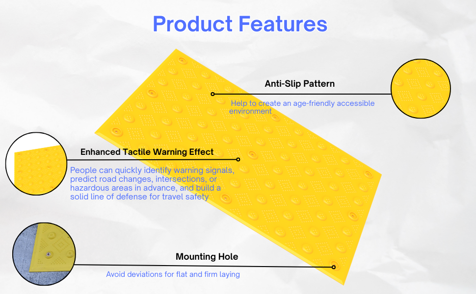 تصميم هيكلي دقيق، تأثير تحذيري محسّن عن طريق اللمس: يتميز كل بلاط رصف عن طريق اللمس بملمس ردود فعل لمسية يمكن تمييزه بوضوح على سطحه. سواء كان الأفراد ضعاف البصر يكتشفون عبر عصا بيضاء أو يعتمدون على الإدراك الأخمصي، يمكنهم التعرف بسرعة على إشارات التحذير، والتنبؤ بتغيرات الطريق، أو التقاطعات، أو المناطق الخطرة مقدمًا، وبناء خط دفاع قوي من أجل سلامة السفر.