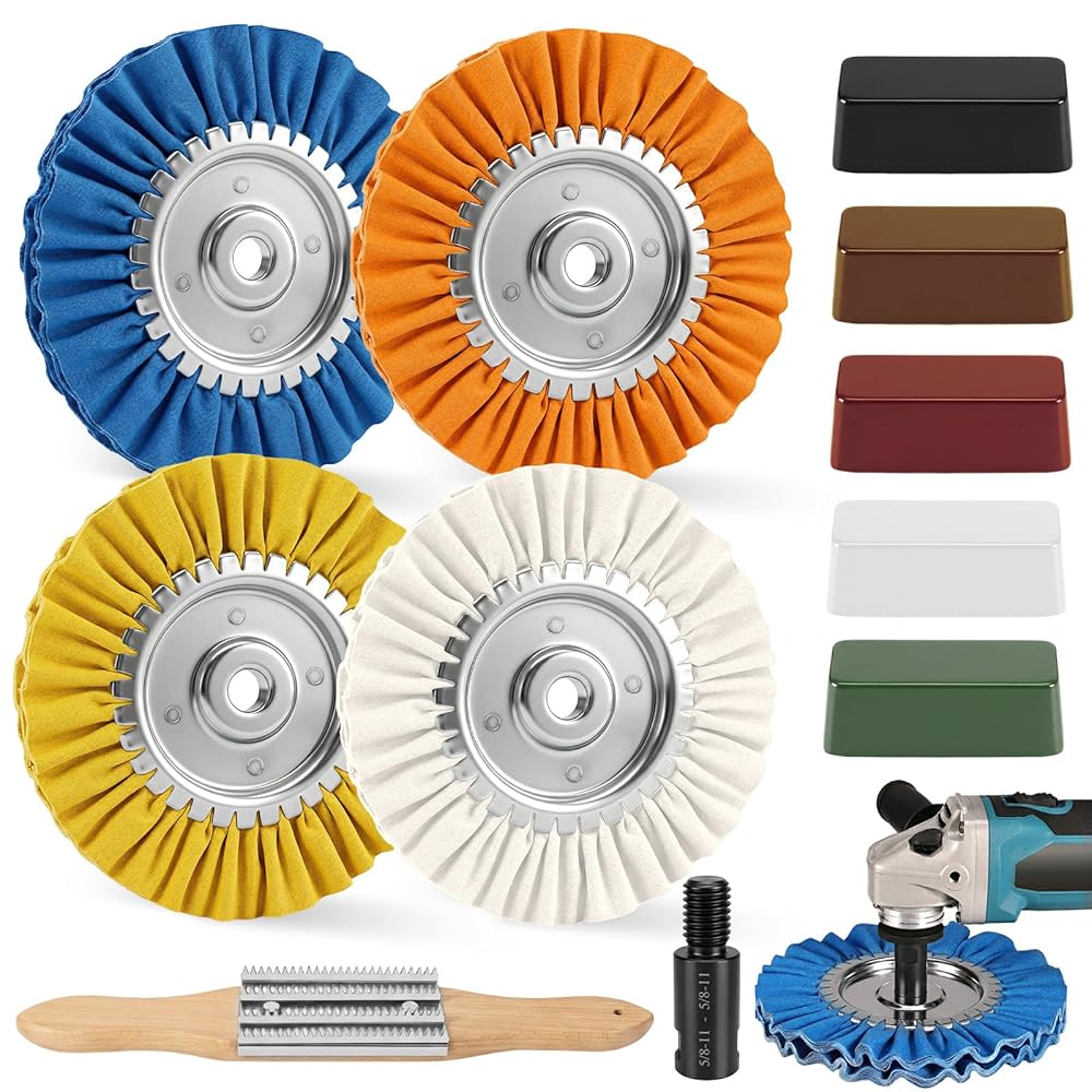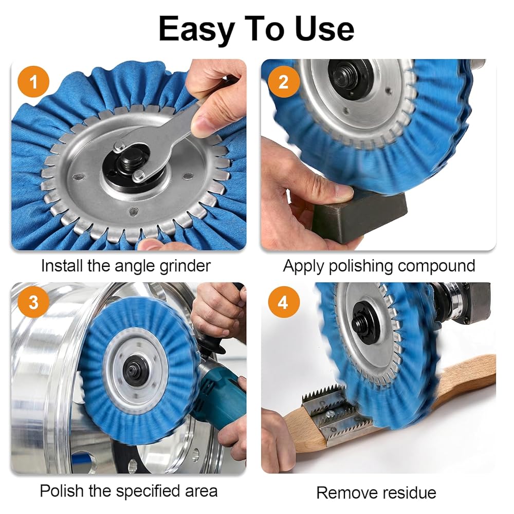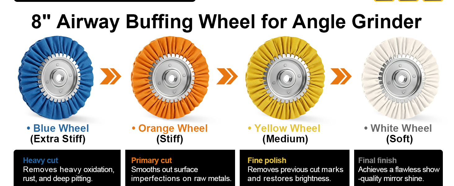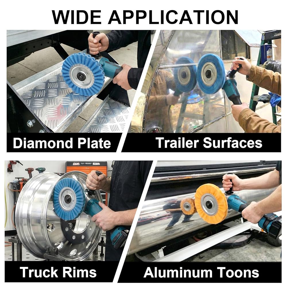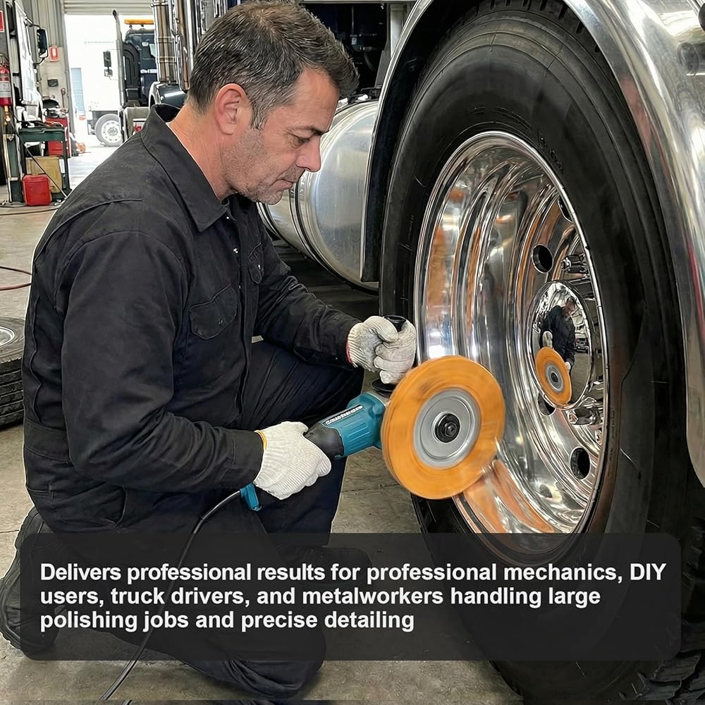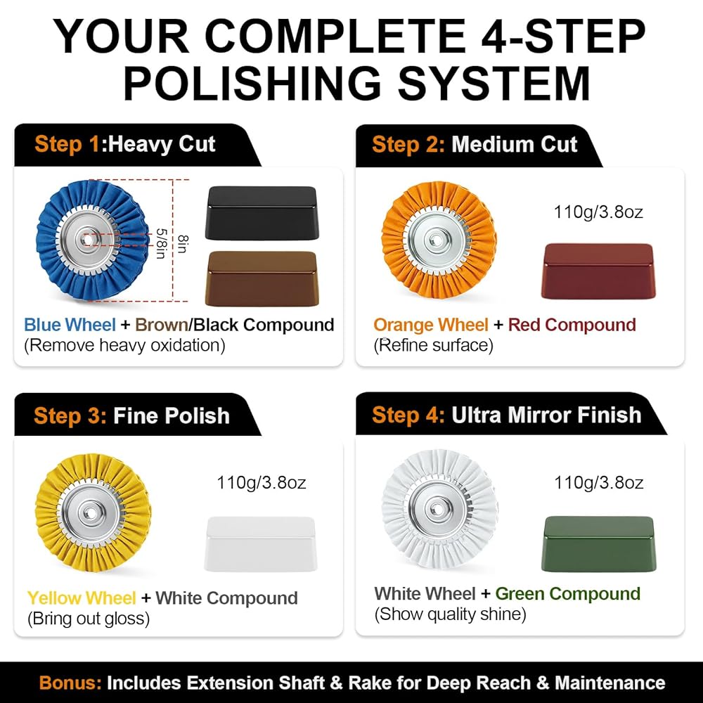 • نظام تشطيب مرآة مرمز بالألوان من 4 مراحل - احصل على تألق صالة العرض من خلال نظام التقدم البديهي الخاص بنا. ابدأ باستخدام العجلة الزرقاء (القطع الثقيل) لإزالة الأكسدة والتشويه؛ الانتقال إلى البرتقالي والأصفر للتنعيم؛ وانتهي باستخدام العجلة البيضاء للحصول على طلاء مرآة فائق الدقة. مثالي لاستعادة الألومنيوم المهمل والفولاذ المقاوم للصدأ والنحاس والنحاس الأصفر إلى بريق عاكس