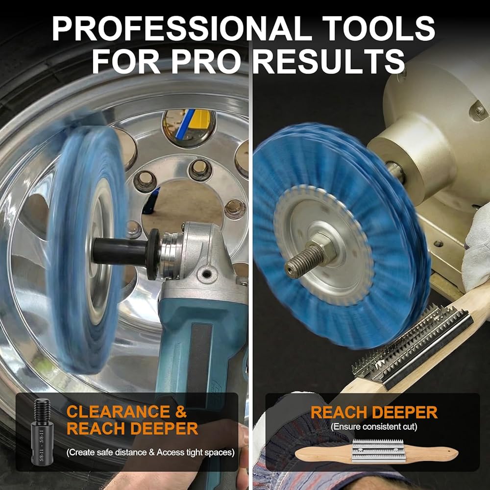 • مجموعة احترافية كاملة مع التهذيب والتمديد - على عكس المجموعات الأساسية، تتضمن مجموعة تلميع الألومنيوم الخاصة بنا أدوات أساسية للحصول على نتائج احترافية. نحن نقوم بتضمين مشط عجلة تلميع لتنظيف المركب المتبقي وزغب مجرى الهواء لإطالة العمر الافتراضي، وعمود تمديد خيط أنثوي 5/8 بوصة - 11 لمنع العجلة من التأثير على الأداة وتلميع المناطق التي يصعب الوصول إليها بأمان مثل عجلات الأطباق العميقة أو مكونات المحرك دون أن تصطدم المطحنة بالسطح. كما نقدم أيضًا قضبان مركبة تلميع أكبر بوزن 110 جم تضمن لك إمكانية إكمال مهام واسعة النطاق.