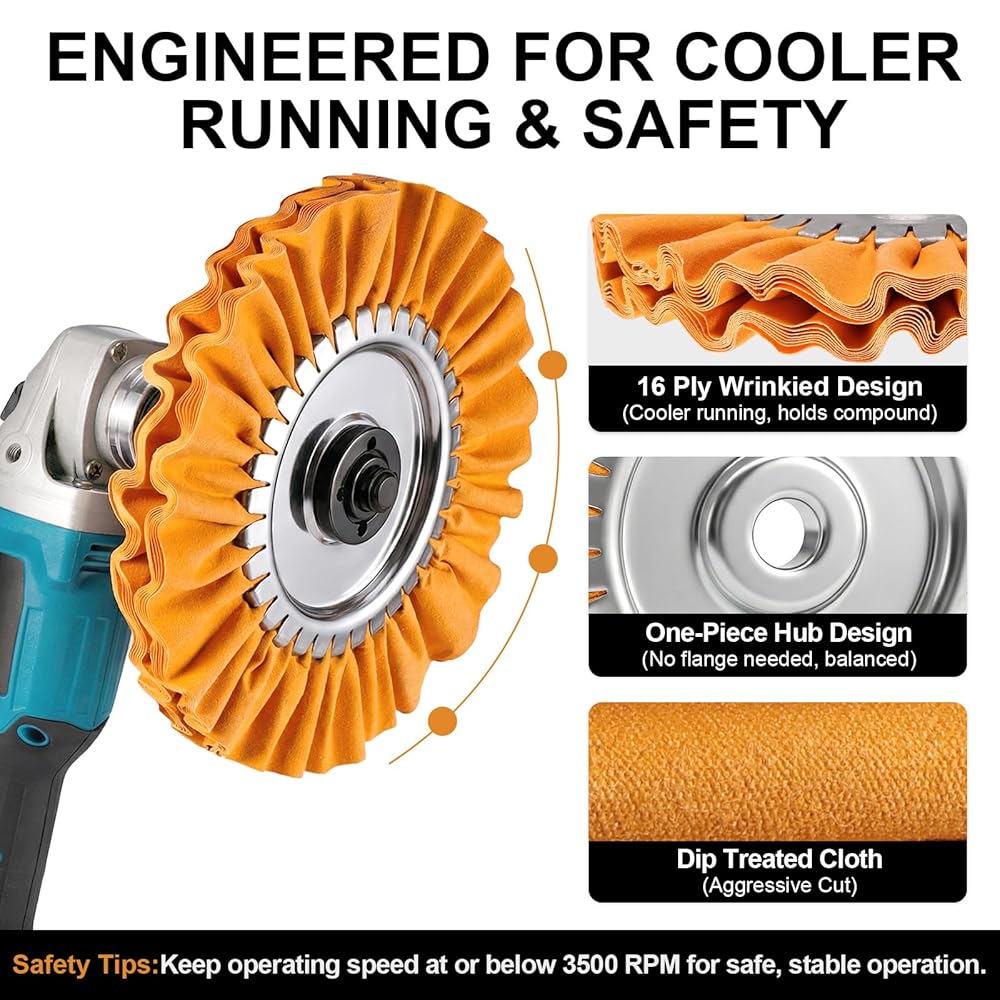 • تركيب آمن خالٍ من الشفة - لا تتطلب عجلة التلميع أي وصلة شفة. يقوم المحور المكون من قطعة واحدة بتثبيت العجلة في مكانها بشكل آمن، مما يمنع التذبذب أو الانفصال أثناء التلميع عالي السرعة من أجل تشغيل يومي أكثر أمانًا وملاءمة. تم تصميم عجلاتنا بحلقة مركزية من الفولاذ المجلفن ونسيج مطوي مكون من 16 طبقة، وهي تعمل بشكل أكثر برودة وتدوم لفترة أطول من هواة القطن السائب القياسي. هام: من أجل السلامة والأداء الأمثل، حافظ على عدد الدورات في الدقيقة أقل من 3500. يعمل تصميم مجرى الهواء المتخصص على تبديد الحرارة، مما يمنع احتراق المعادن الحساسة مع الحفاظ على السلامة الهيكلية