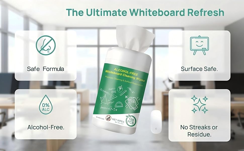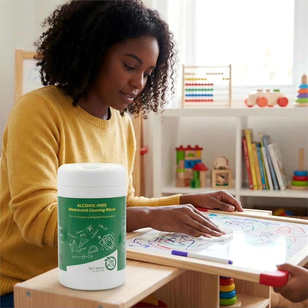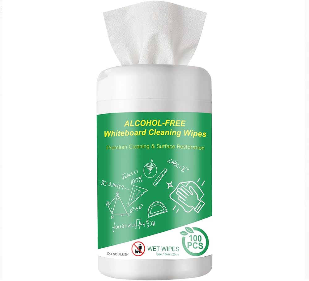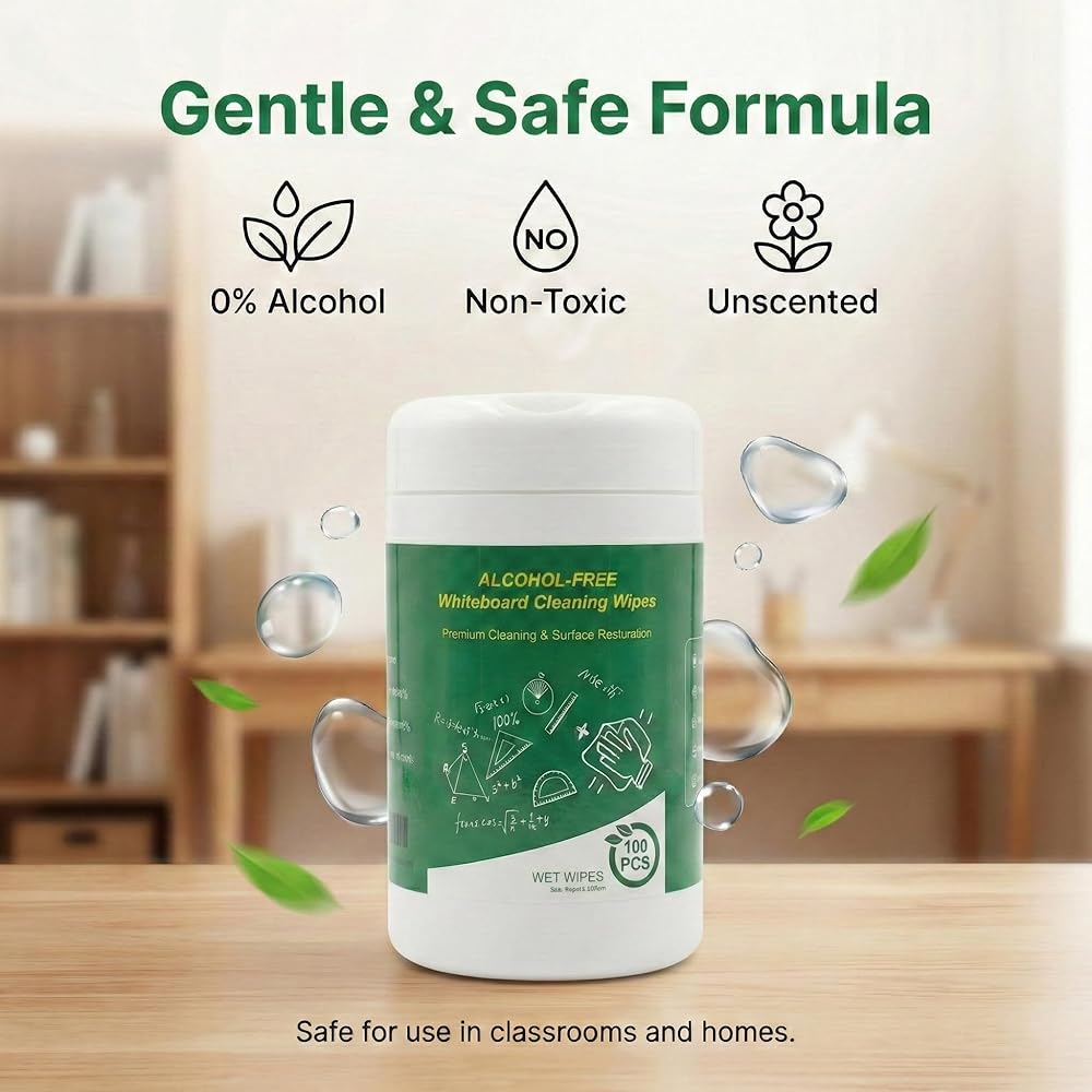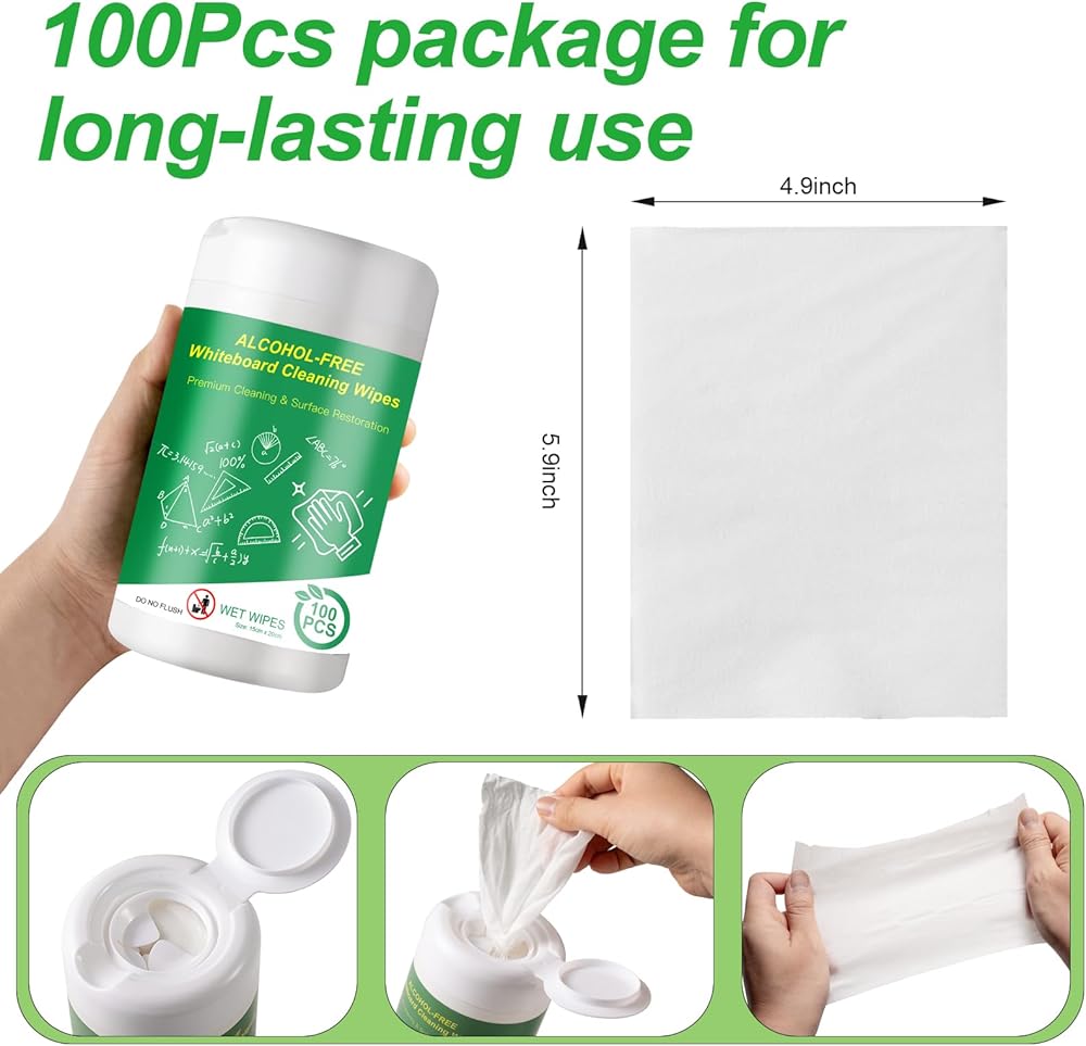 100 قطعة من مناديل تنظيف السبورة البيضاء غير الكحولية، منظف السبورة البيضاء الجاف، مناديل غير سامة، آمنة لجميع الأسطح، تزيل البقع والبقايا بسهولة دون إتلاف السبورات البيضاء