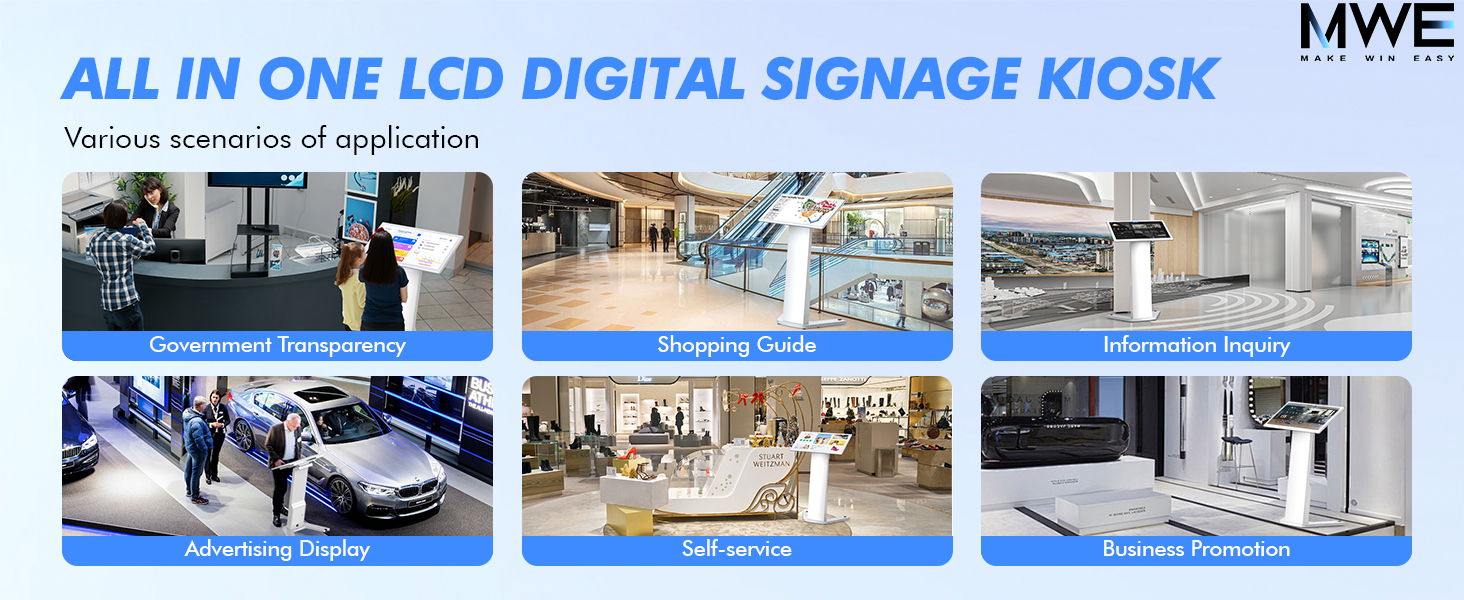 اتصالات متعددة وإدارة ذكية: تعامل بسهولة مع المحتوى واتصالات الجهاز. باستخدام Wi-Fi وEthernet، يمكنك إدارة التحديثات عن بعد وبث المحتوى بسلاسة. قم بنقل الملفات عبر USB 2.0 أو بطاقة TF بطريقة التوصيل والتشغيل. يتيح منفذ HDMI إخراج فيديو عالي الجودة من الأجهزة الخارجية. يعد كشك MWE التفاعلي مثاليًا للبنوك ومراكز التسوق والفنادق والمطاعم والمستشفيات والمتاحف والحرم الجامعي. يحتوي كشك الخدمة الذاتية هذا على مكبري صوت بقدرة 5 وات، يمكنك استخدامهما لتشغيل مقاطع الفيديو والموسيقى الإعلانية الخاصة بك.
