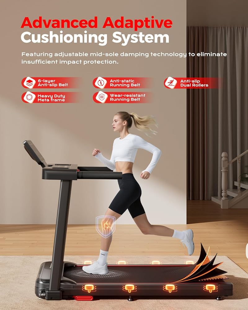 Advanced Cushioning for Joint Protection: With 6 shock absorbers and dual-layer cushioning, these treadmills with incline significantly reduce joint impact. The system ensures fluid strides—especially valuable during treadmill incline training—enabling longer workouts with greater comfort and less fatigue